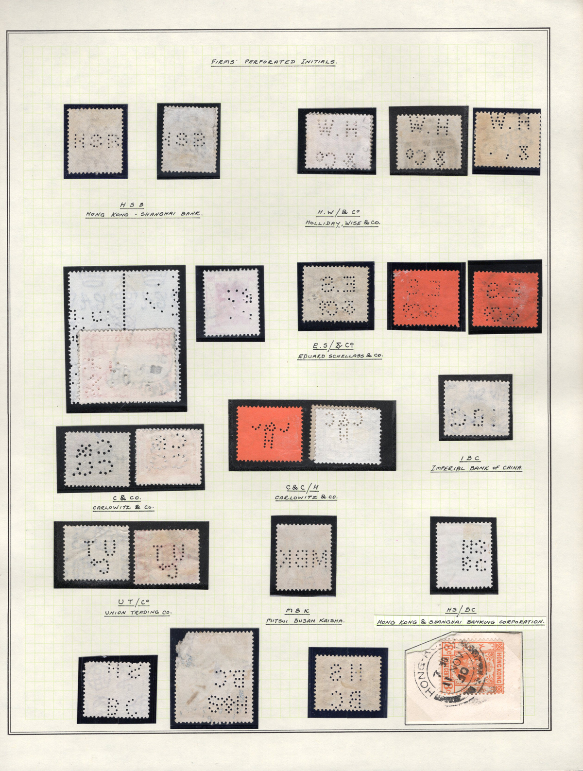 414 O   imagePage of QV to QEII Stamps with Firms’ Perforated Initials, 22 stamps show 10 different firms. These were used to prevent stamp theft, very fine.