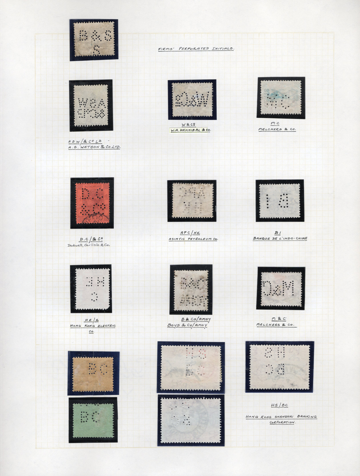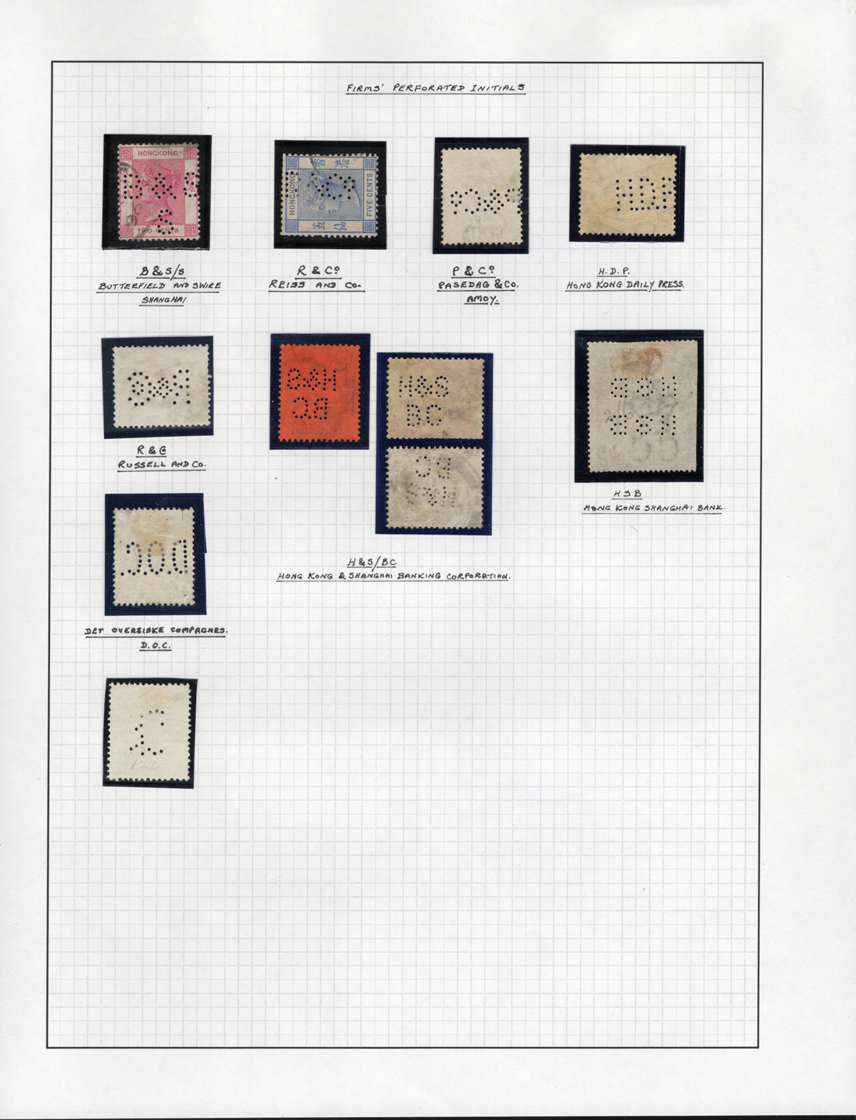417 O   imagePage of QV to KGVI Stamps with Firms’ Perforated Initials, 11 stamps show 8 different firms. These were used to prevent stamp theft, very fine.