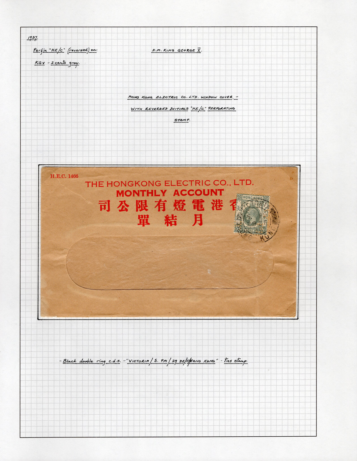 420 CVR   image1937 Hong Kong Electric Co. Ltd. Cover with Perforated Initials on the 2c King George V perfin stamp, postmarked Victoria DEC.29.1937, very fine.