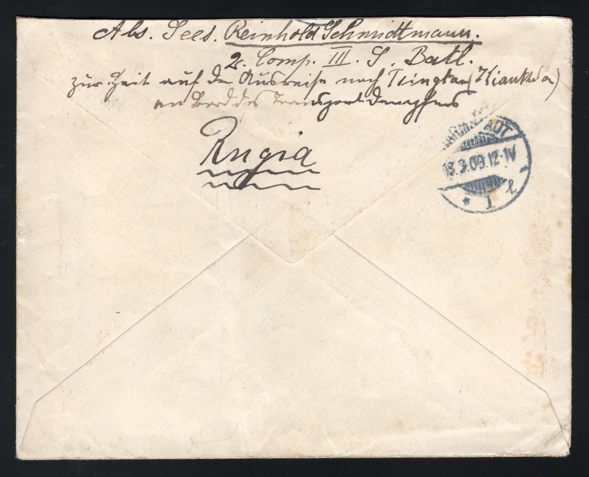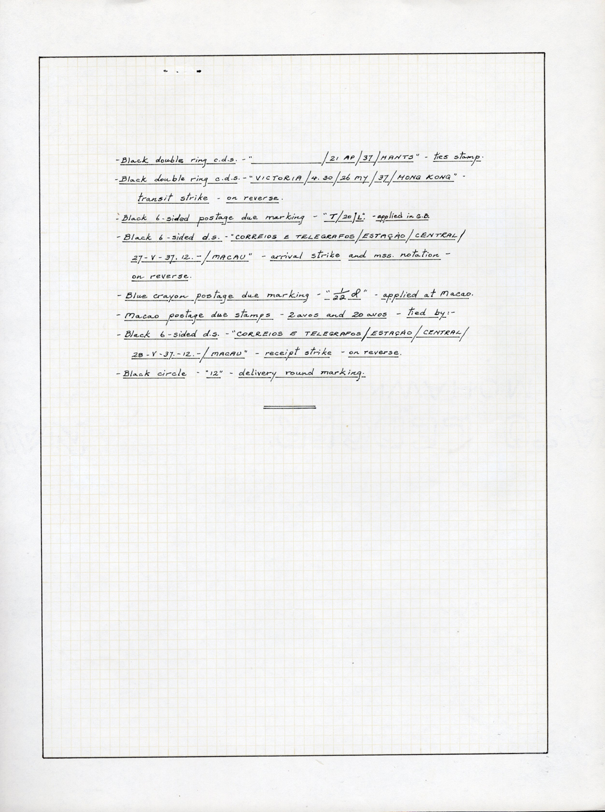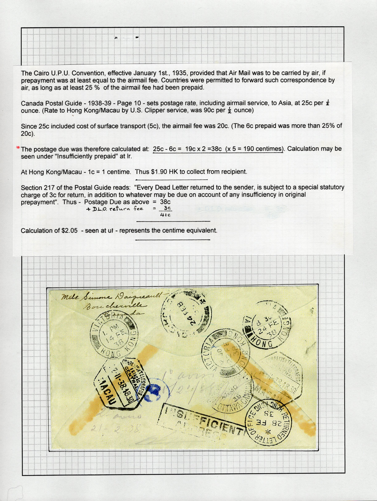 black, as well as several Macau, Hong Kong, etc. datestamps on back, plus a number of manuscript and handstamps having to do with the due assessment. A most interesting and very fine cover, extensively written-up on two pages. (Scan 1)