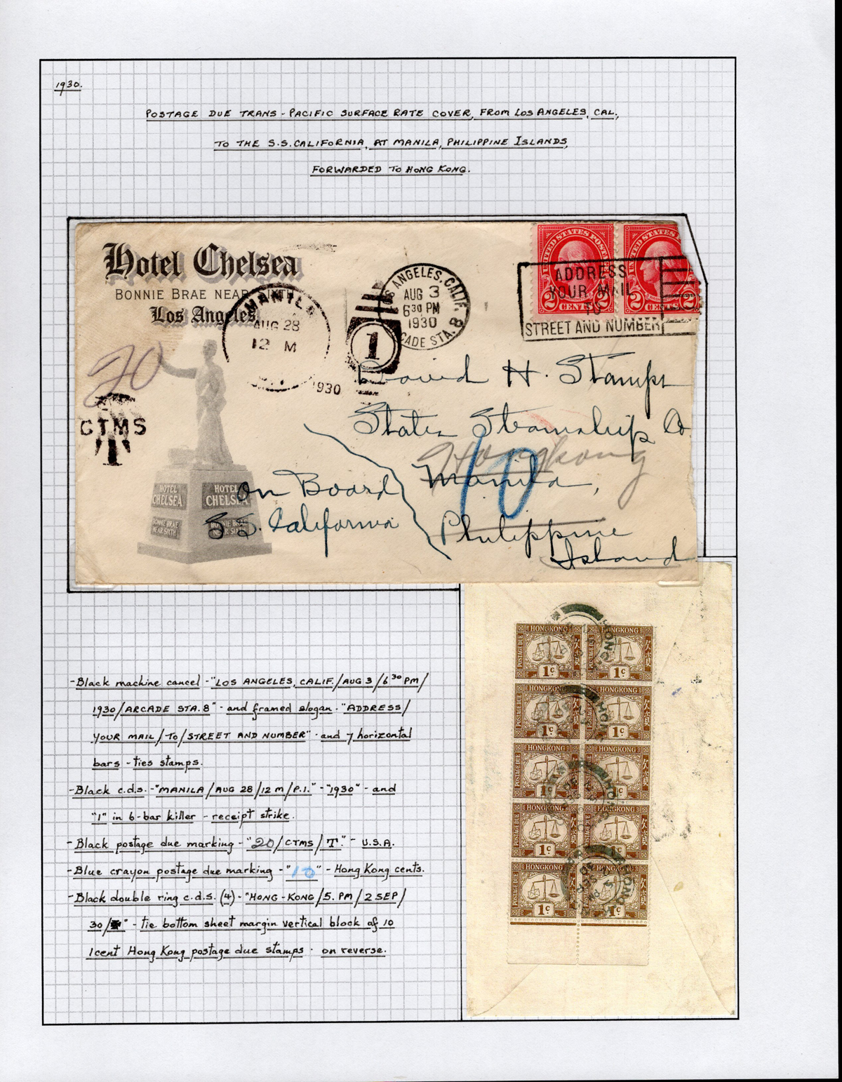 Postage Due Cover to Philippine Islands, Forwarded to Hong Kong, mailed from Los Angeles on AUG.3.1930 to the S.S. California in the Philippines, with AUG.28 Manila receiver, forwarded to Hong Kong, where a sheet margin block of 10 of the Hong