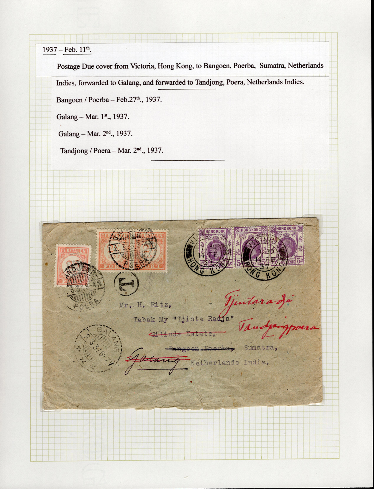 Postage Due Cover to Sumatra, Netherlands Indies, mailed Victoria / Hong Kong on FEB.11.1937 (with 15c worth of postage applied) to Sumatra (Galang MAR.1 receiver) with three Netherlands Indies Postage Due stamps applied (tied by Tandjong / Petra