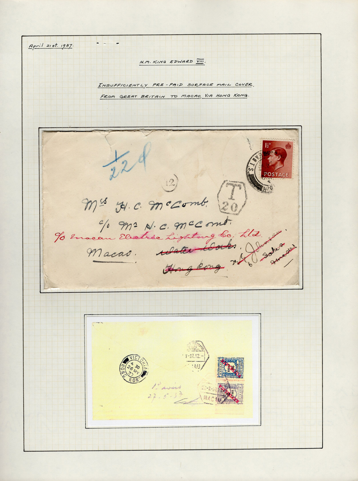 Postage Due Cover to Hong Kong, Forwarded to Macao, mailed with a 1½d King Edward VIII to Hong Kong ( MAY.26 receiver on back), forwarded to Macao (MAY.28 receivers on back), with 6-sided “T 20” handstamp, a blue crayon “1 / 22d” a small “12” in