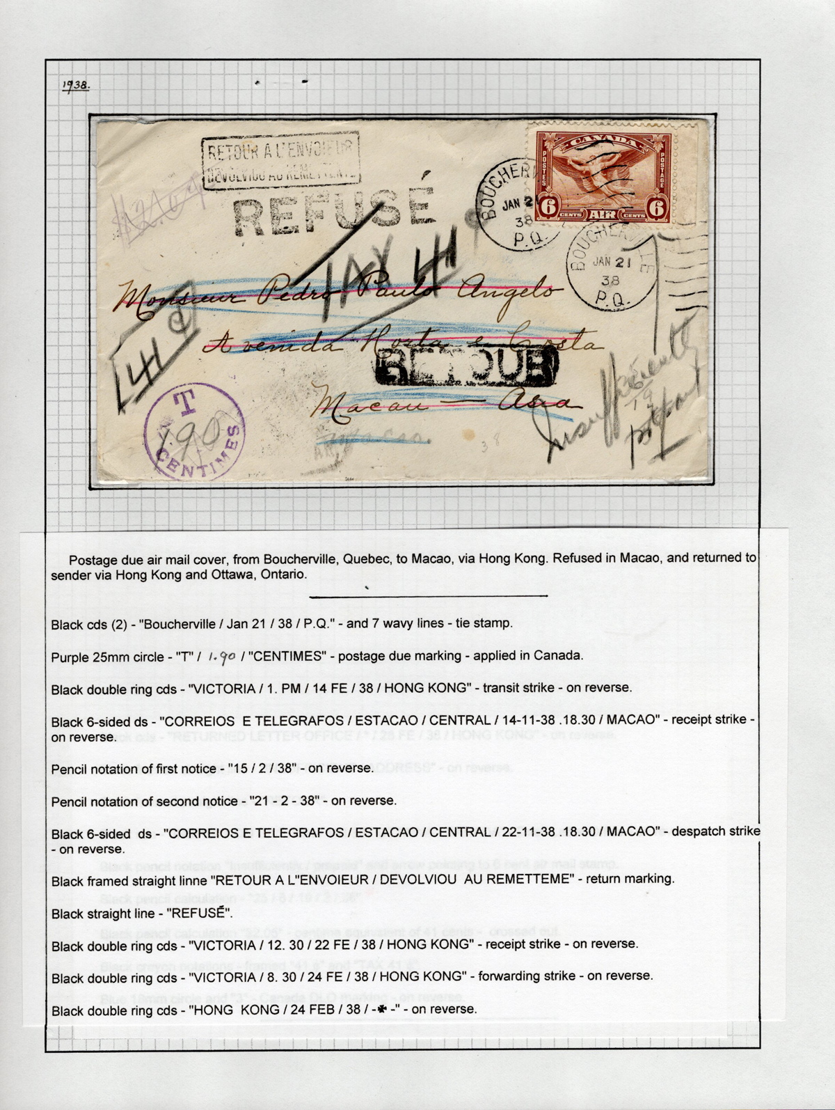 Due Refused Cover to Macau, via Hong Kong, mailed from Boucherville PQ on JAN.21.1938 (duplex strikes tie the 6c Airmail issue) addressed to Macau Asia, with “Insufficient Address”, “Detour a L’envoyeur…”, “REFUSE” and a “RETOUR” handstamps in