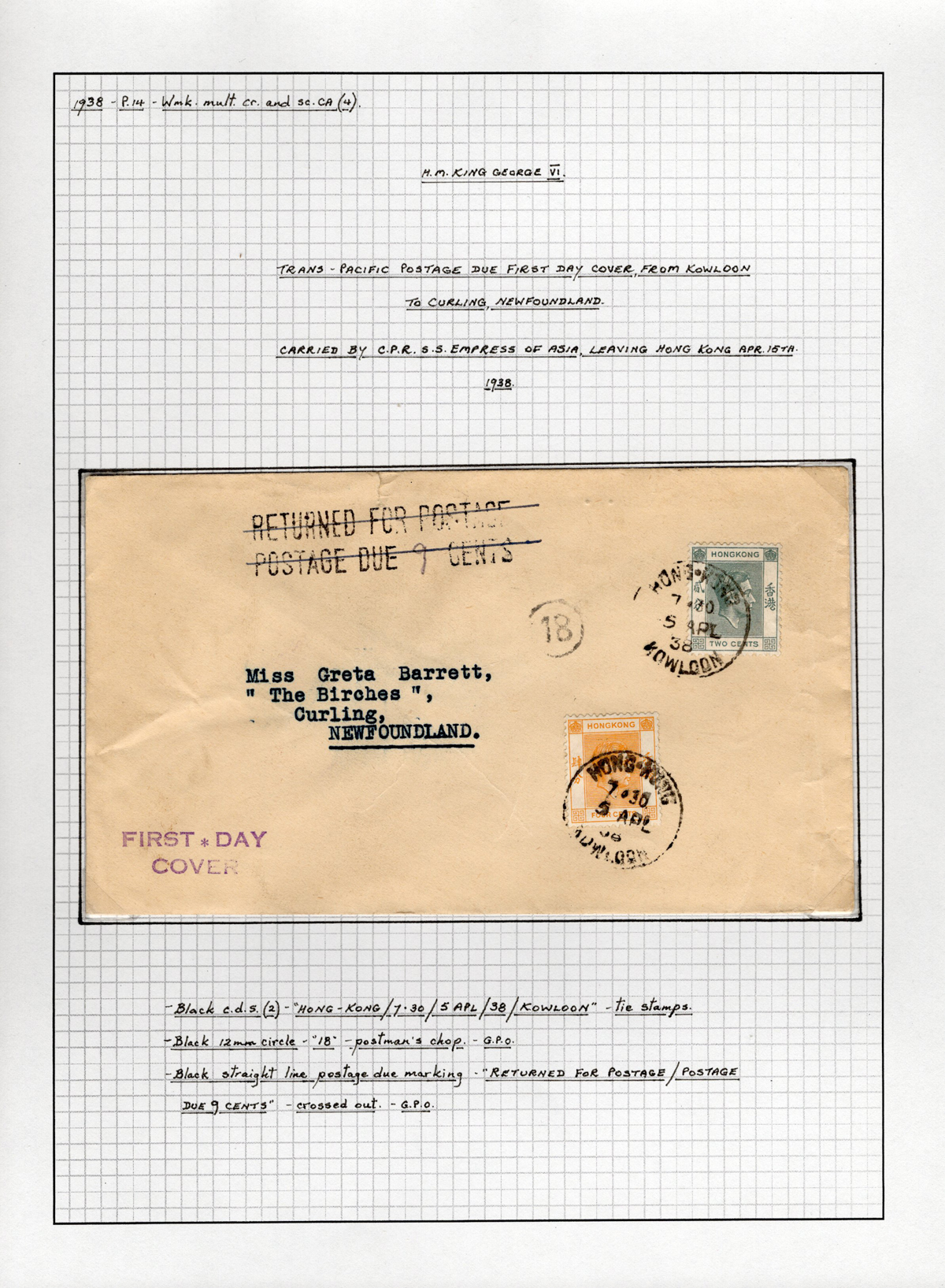 Day Cover to Curling, Newfoundland, mailed from Kowloon on APR.5.1938 with a 4c and a 2c KGVI issues. Originally hand stamped “RETURNED FOR POSTAGE / POSTAGE DUE 9 CENTS” but crossed-out, with small circled “18” handstamp, very fine.