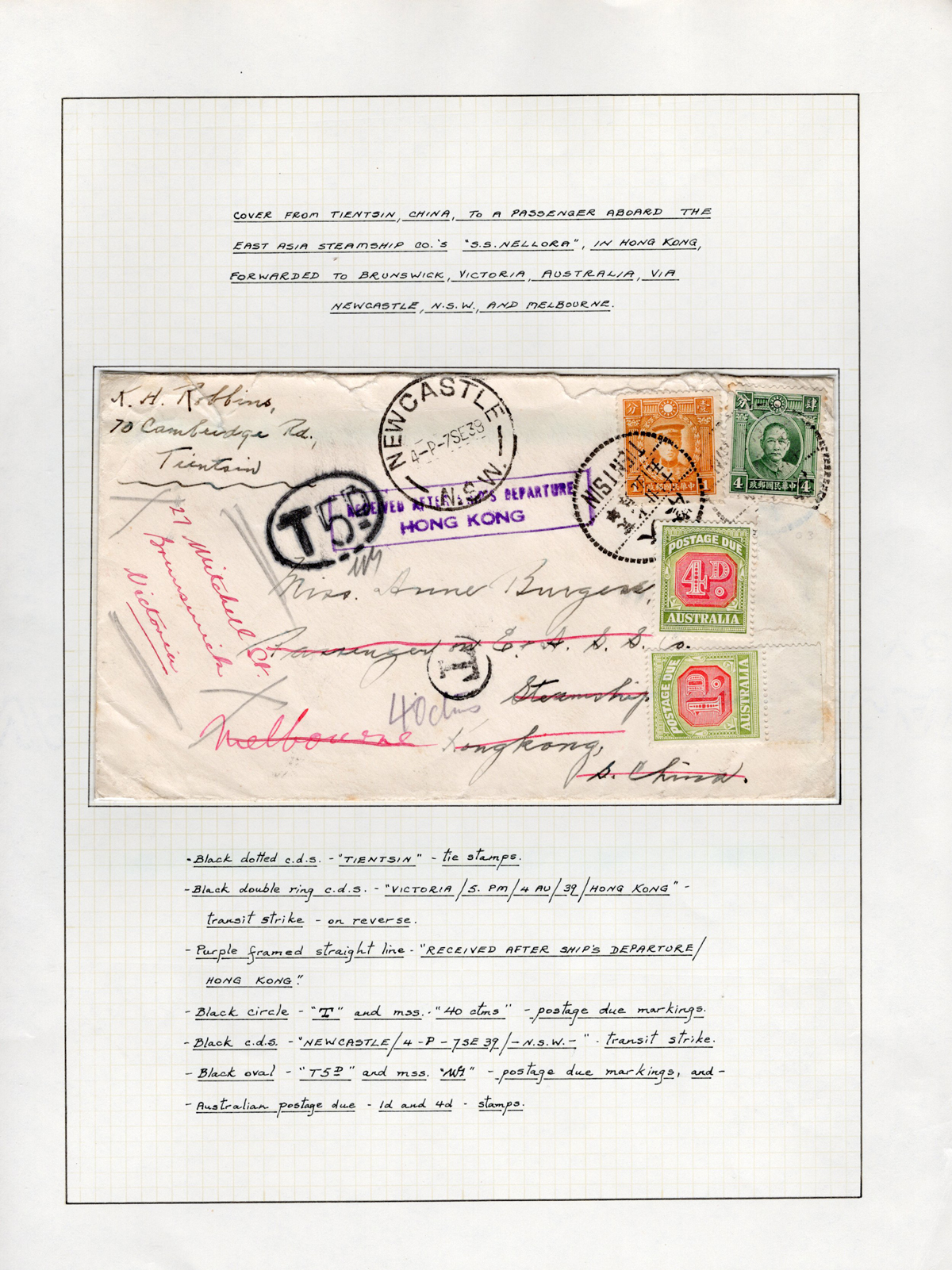 Due Cover to Hong Kong, Forwarded to Australia, mailed from Tientsin to a passenger aboard the S.S. Nellora in Hong Kong (AUG.4 receiver on back) with a boxed “Received after ship’s departure / Hong Kong” in purple. The cover was then forwarded