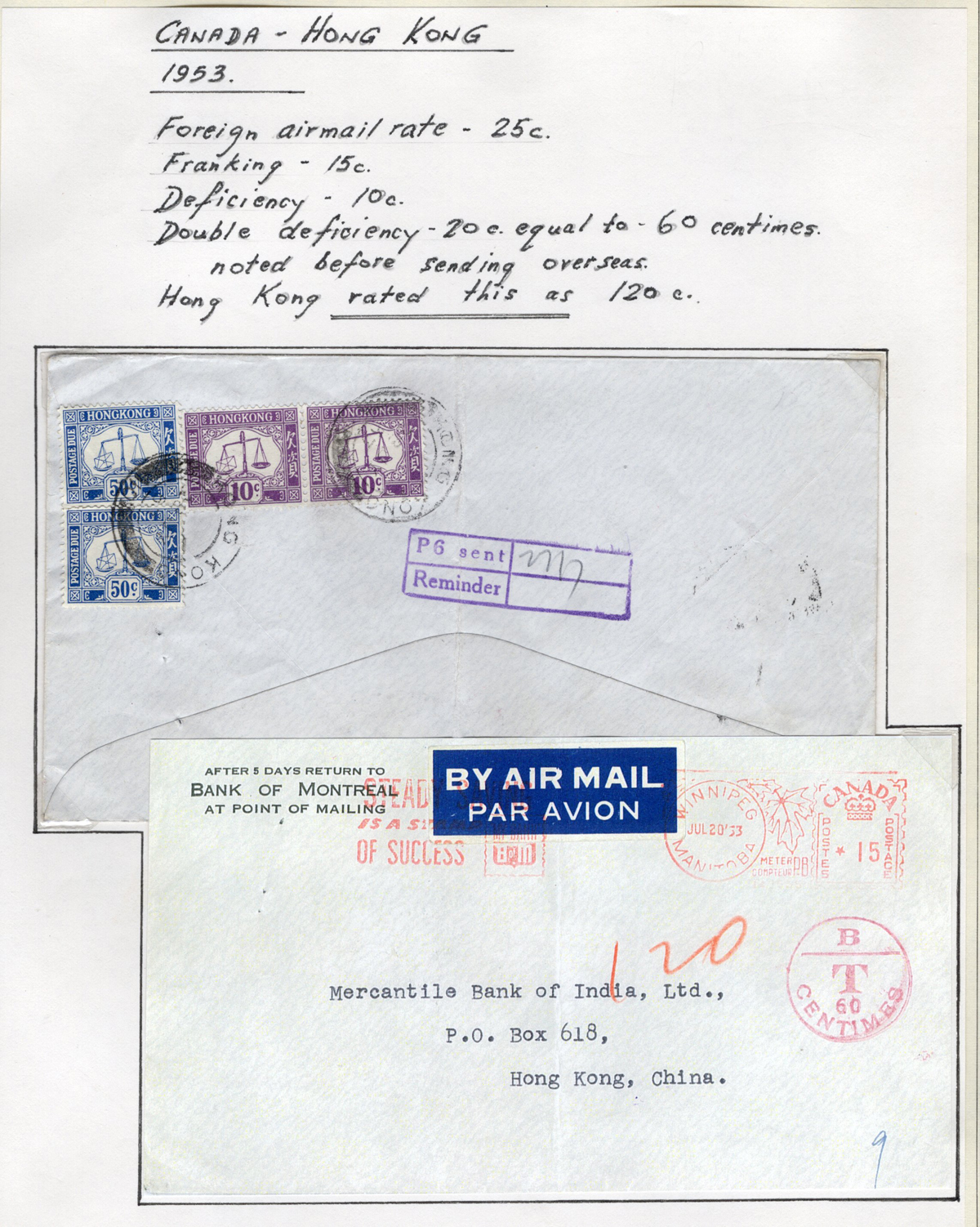 Postage Due Cover to Hong Kong, a Bank of Montreal cover mailed from Winnipeg on JUL.20.1953 (15c meter stamp) with a violet circled “T / 60 / CENTIMES” handstamp and red crayon “120”, with two 10c and two 50c HK Postage Due stamps (totaling