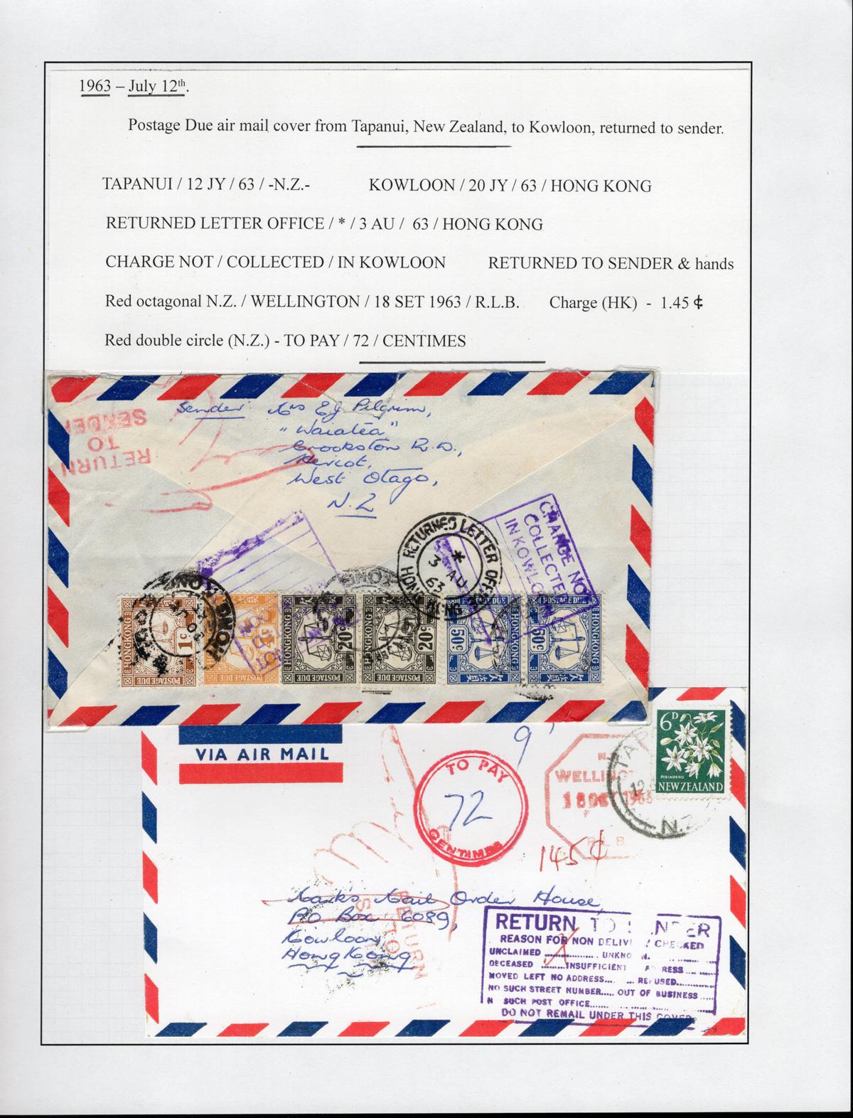 Airmail Postage Due Cover to Hong Kong, mailed from Tapanui, NZ to Kowloon HK via Wellington NZ, with double circle “TO PAY / 72 / CENTIMES” and red “145c” manuscript notation, with 6 HK Postage Due stamps on back (totaling HK$1.45, double