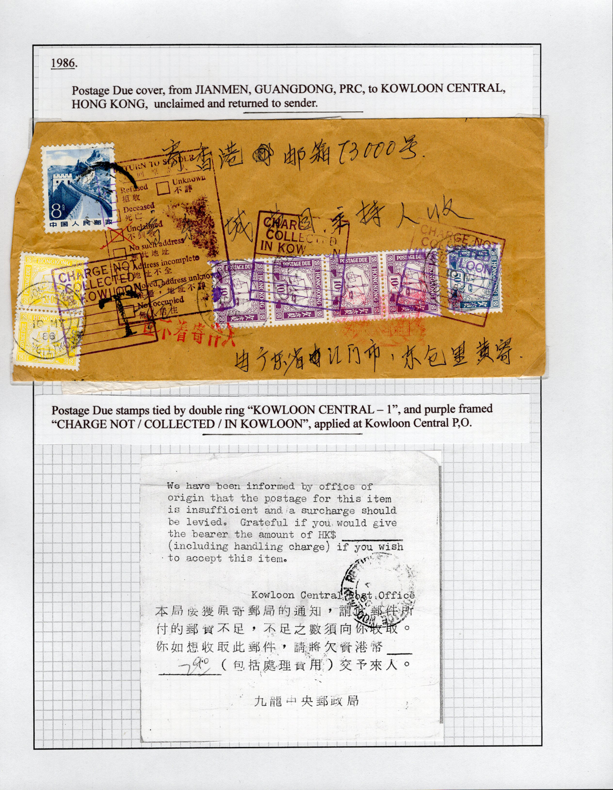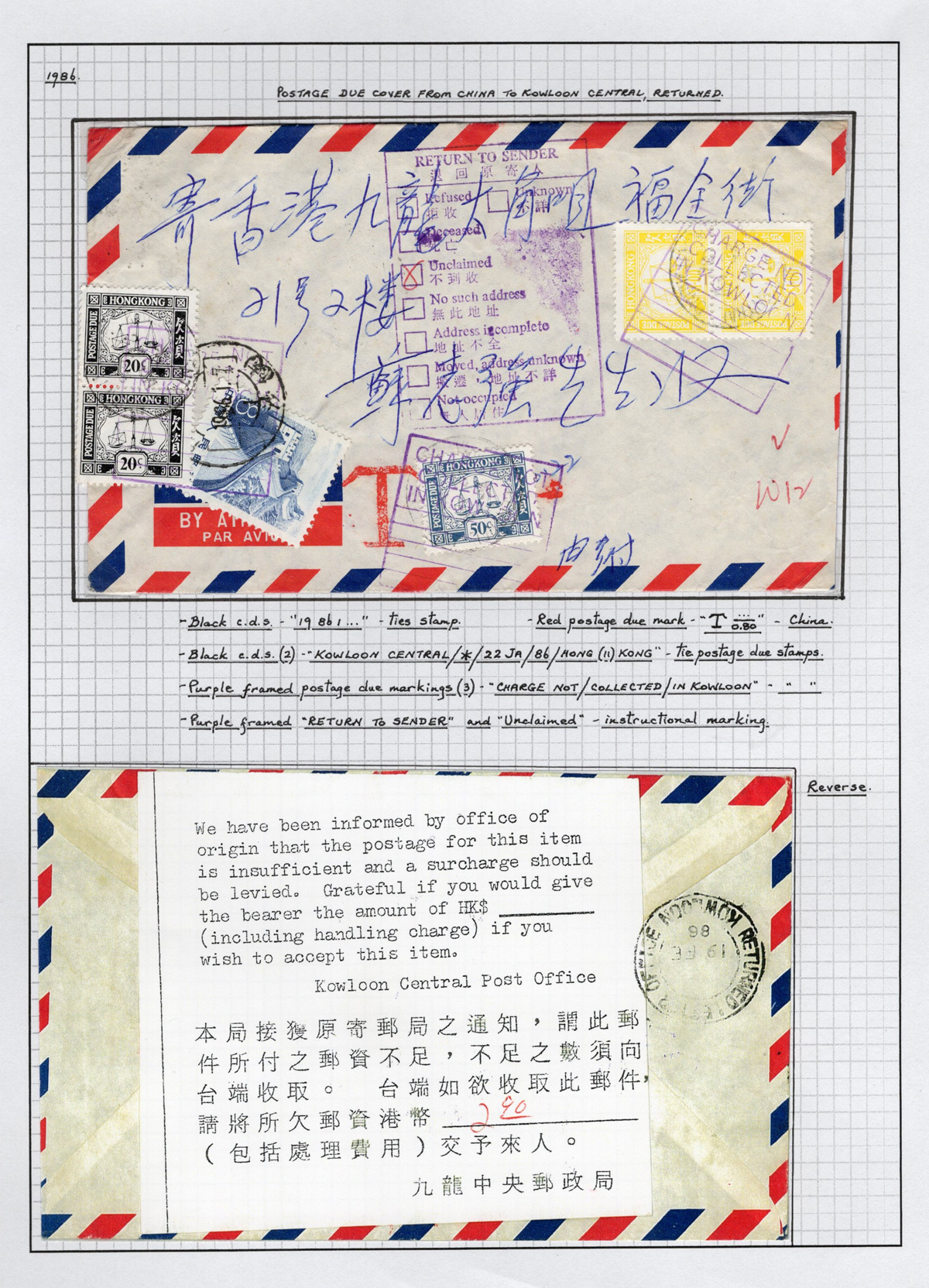 Postage Due Cover to Hong Kong, mailed with only an 8f stamp to Kowloon, with a FEB.19.1986 receiver, with HK$2.90 worth of HK Postage Due stamps added, with purple boxed “Charge Not / Collected / in Kowloon” handstamp and purple boxed “Return to