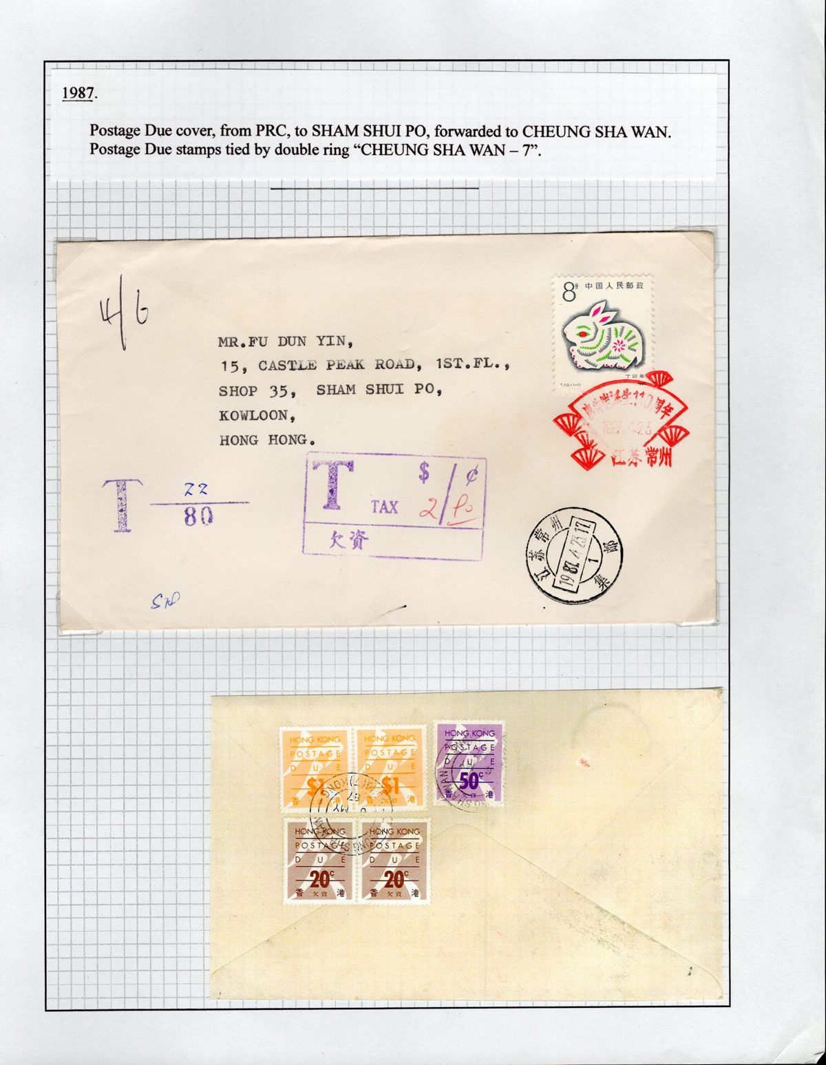 Due Cover to Hong Kong, mailed to Sham Shui post office in Kowloon, forwarded to Cheung She Wan, with HK$2.90 worth of HK Postage Due stamps on back, and two different purple tax handstamps, very fine.