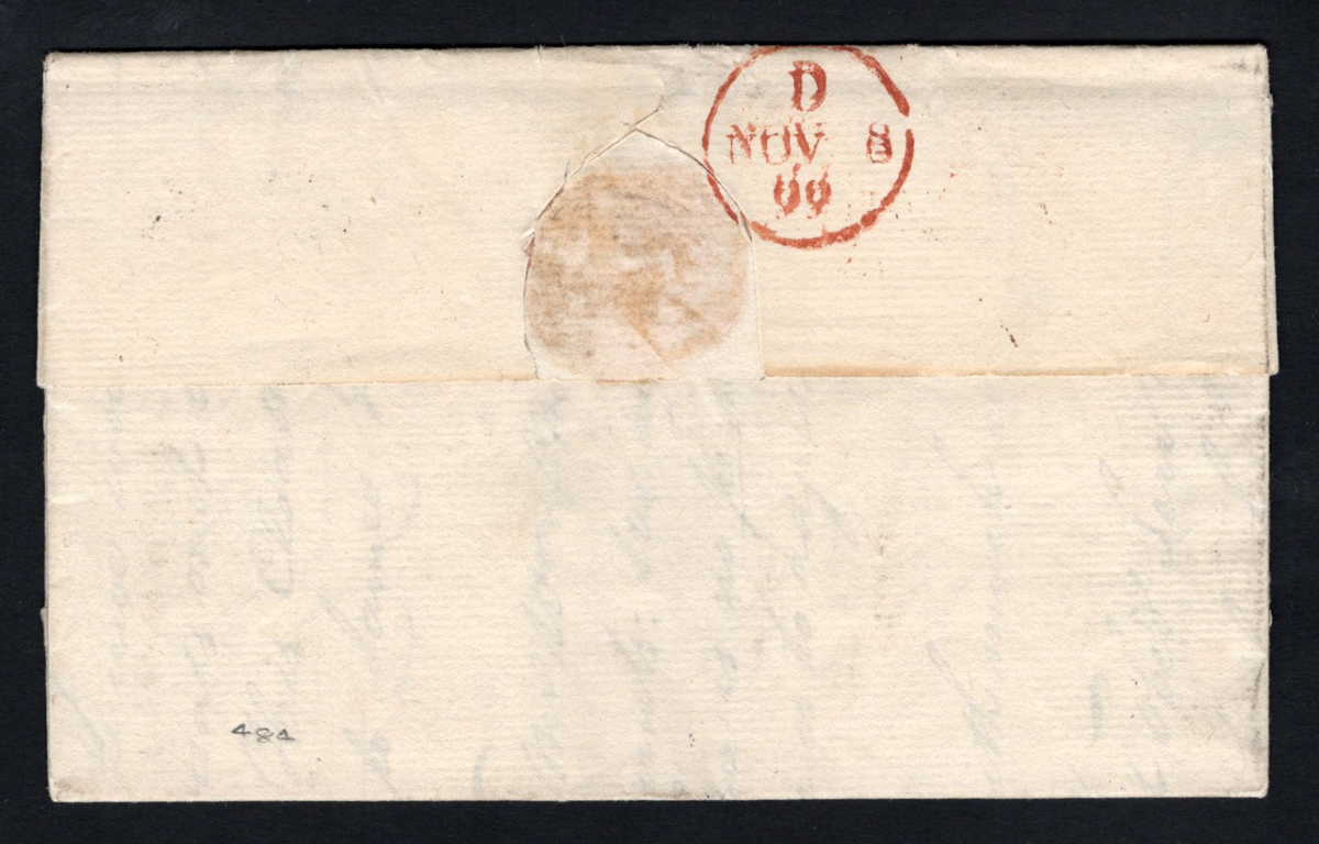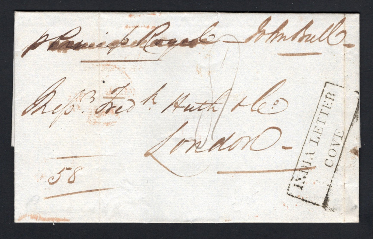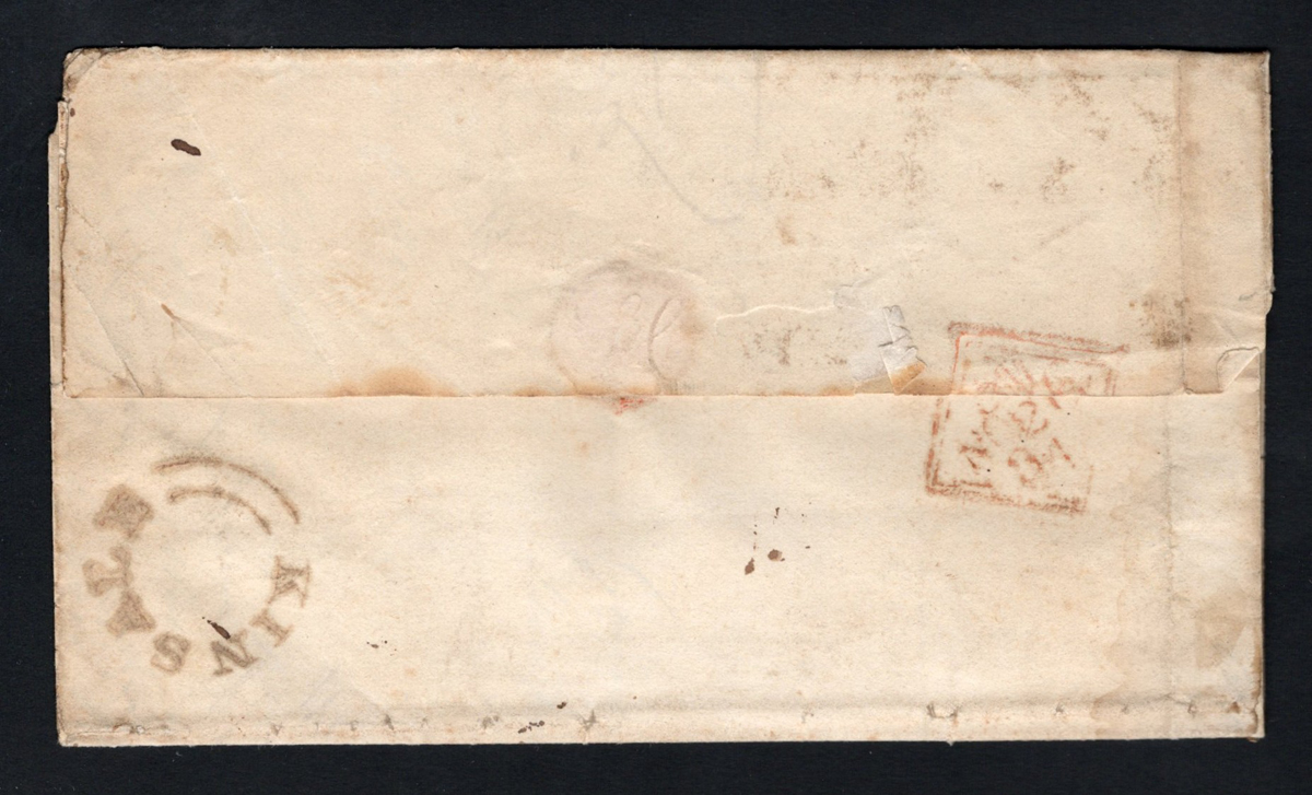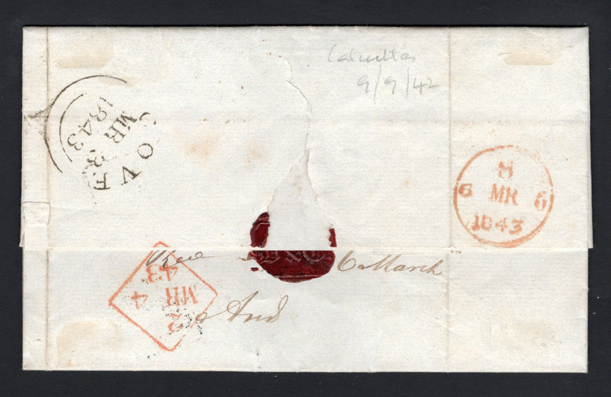 543 CVR   image1842-43 Folded Letter from Calcutta to London, a lengthy letter datelined Calcutta SEP.9.1842 addressed to London and endorsed (inside) "Pr. India Steamer to Suez, Thence via Marseilles" and on front possibly via the "John Bull". Front has an Irish boxed "India Letter / Cove" handstamp, with matching Cove double broken circle dated MAR.3 on back, alongside a MAR.4.1843 Dublin diamond datestamp in red and a MAR.6 London circular receiver datestamp in red. Overall fine. (Scan 1) (Scan 2) (All Scans) (All Images)