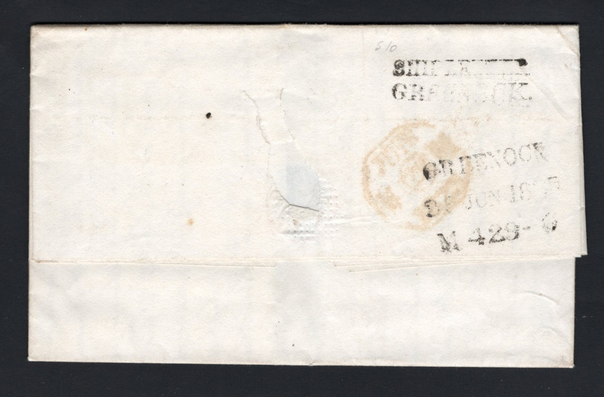 555 CVR   image1823 Folded Letter from Jamaica to Scotland, a two page letter written in Hamilton, Jamaica on APR.17.1923 and endorsed "Ship Rebecca / Capt Alexander" and "Rec'd 30th June 1830". The back shows two handstamps in black: "SHIP LETTER / GREENOCK" and "GREENOCK / 25 JUN 1823 / M 429". Neither of these two appear to be listed in Auckland's "Postal Markings of Scotland to 1840". Very fine. (Scan 1) (Scan 2) (All Scans) (All Images)