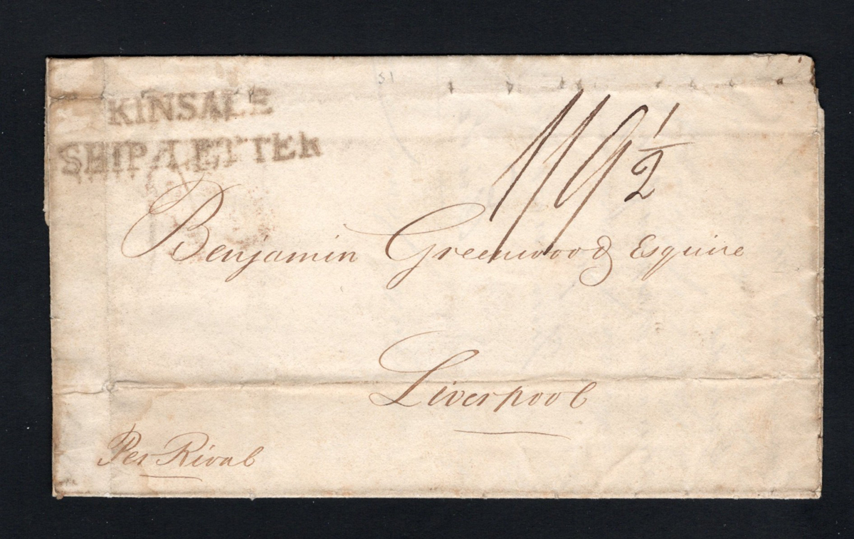 556 CVR   image1834 Folded Letter from Jamaica to England, a one page letter written at Kingston, Jamaica on SEP.24.1834 (month unclear) and addressed to Liverpool, endorsed "Per Rival". Front has a "Kinsale / Ship Letter" handstamp and back has an undated Kinsale c.d.s. as well as a NOV.1934 diamond transit in red. Aging, and part of the letter is glued, else overall fine. (Scan 1) (Scan 2) (All Scans) (All Images)