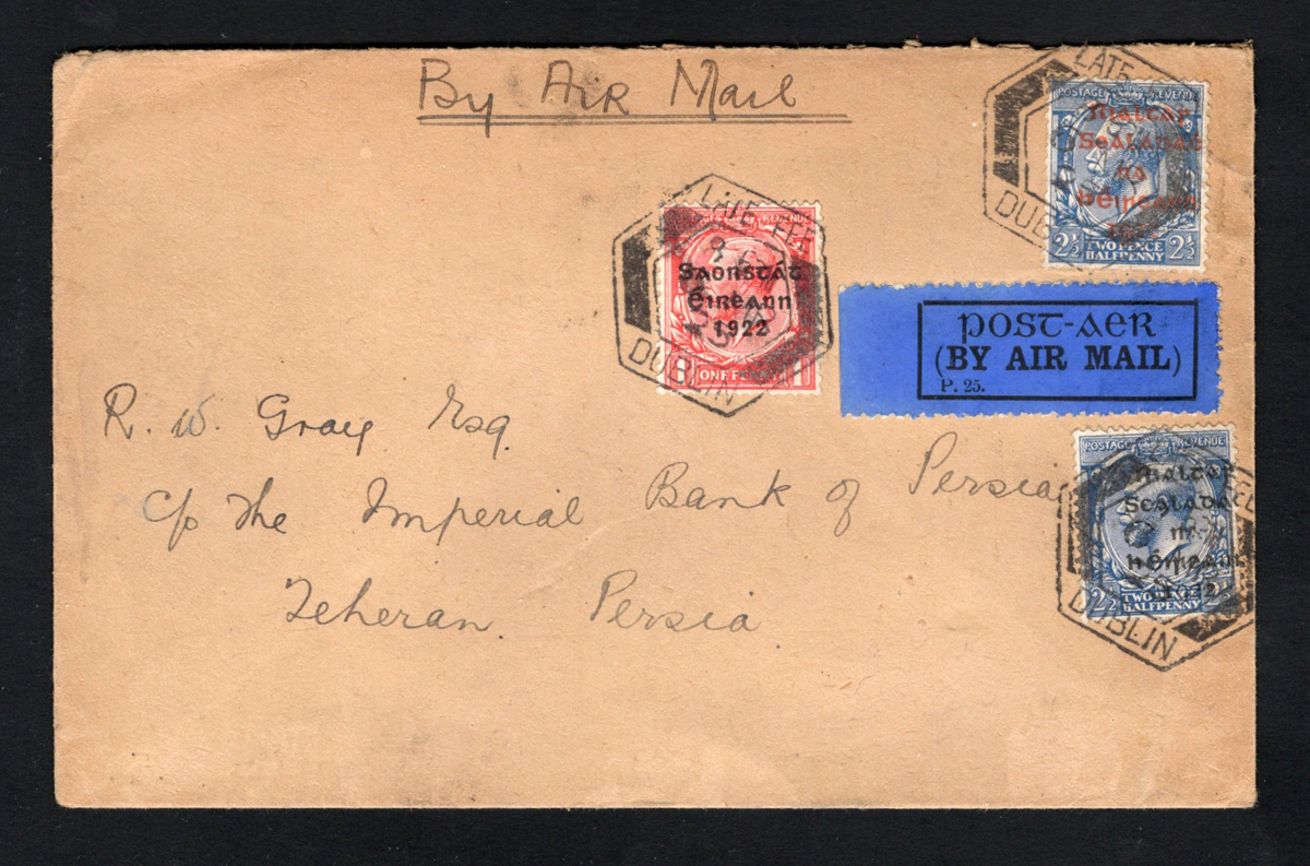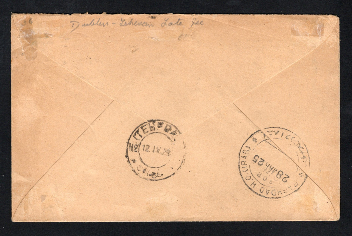 550 CVR   image1925 Late Fee Airmail Cover from Dublin to Persia, mailed from Dublin on MAR.6.1923 (hexagon LATE FEE postmarks) addressed to Teheran, Persia (APR.12 receiver) through Baghdad, Iraq (MAR.28 transit). The cover is franked with three different Provisional Government and Irish Free State overprinted stamps. Very fine. (Scan 1) (Scan 2) (All Scans) (All Images)