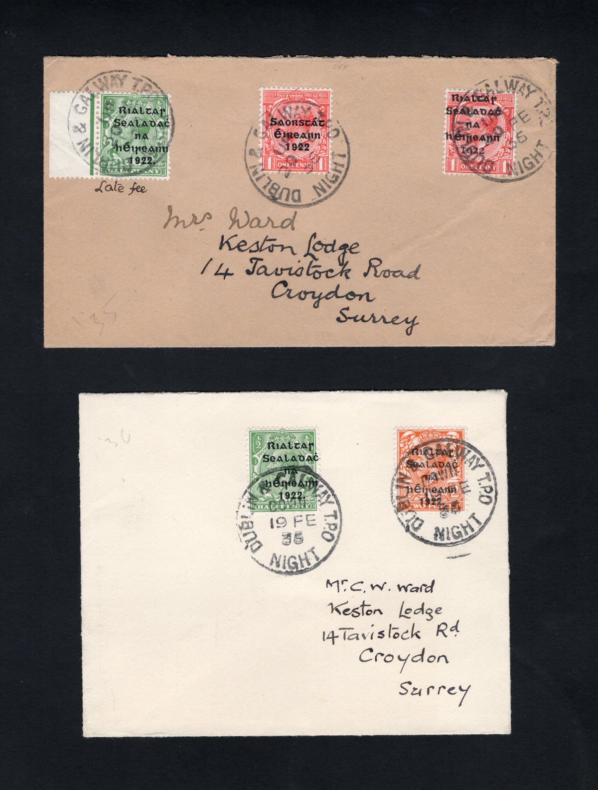 551 CVR   image1936 Two Ireland T.P.O. Covers to Surrey, mailed on FEB.19 and 20.1936 with "Dublin & Galway T.P.O. / Night / " c.d.s. postmarks (one is "UP" and one is "DOWN") canceling a variety of different Provisional Government and Irish Free State stamps, one of which has a "late fee" manuscript below it, very fine.
