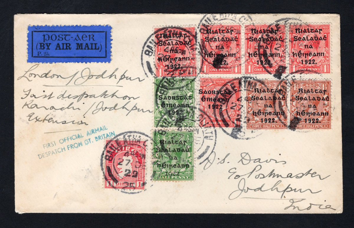 552 CVR   image1929 First Flight Cover London to Jodhpur, mailed from Baile Atha Cliath (Dublin) on DEC.27.1929 and addressed to Jodhpur, India, with Airmail label and cachet in blue green reading "First Official Airmail / Despatch From Gt. Britain", with Jodhpur JAN.6.1930 receiver on back. Franking is made up of 10 various Irish adhesives, very fine. (Scan 1) (Scan 2) (All Scans) (All Images)