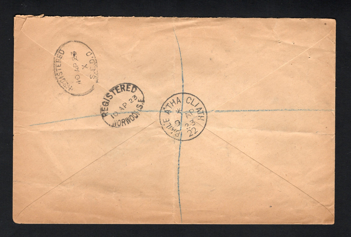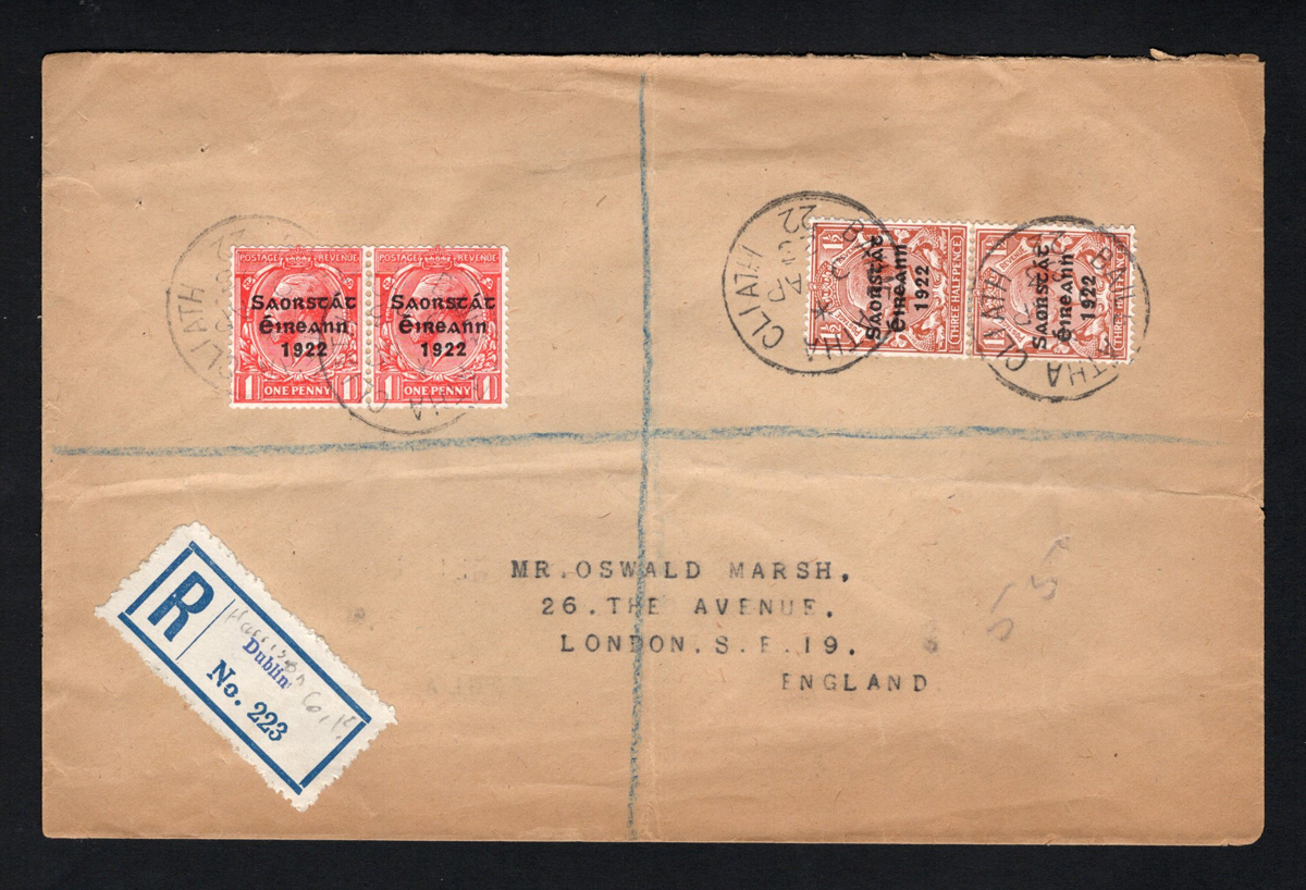 553 CVR   image1923 Registered Cover with Coil Stamp Overprint Variety, mailed from Baile Atha Cliath (Dublin) on APR.9.1923 to London (APR.10 receivers on back). The cover is franked with two coil pairs, a 1d pair and a 1½d pair, the latter with one stamp having a "Tall 1" variety, Scott #61a, U$325 for used. Wrinkles, else very fine and scarce. SG #69a, £300 for off-cover used. (Scan 1) (Scan 2) (All Scans) (All Images)