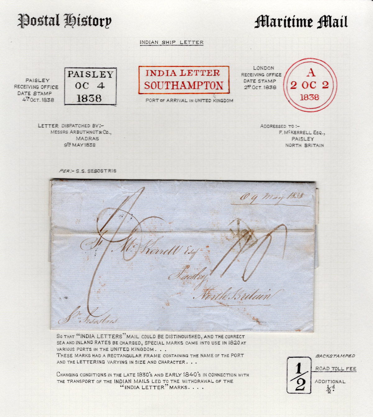 542 CVR   image1838 Folded Letter Madras to Scotland, the letter inside is datelined Madras 9th May 1838 and is addressed to Paisley, North Britain. Sailed on the S.S. Sesostris, with a boxed "INDIA LETTER / SOUTHAMPTON" handstamp in red, London OCT.2.1838 double circle in red, boxed "PAISLEY / OC 4 / 1838" handstamp in black, and a boxed "1/2" for the road toll fee. Fine and neatly written-up.