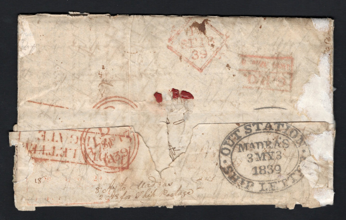 541 CVR   image1839 Folded Letter India to Ireland, a very lengthy (cross-written) personal letter inside is datelined Secunderabad 29th April 1839, and is addressed to Dublin, Ireland. There is a large double oval "OUT STATION / SHIP LETTER / MADRAS / MAY.3.1839" handstamp, next to a boxed "INDIA LETTER / ___GATE" handstamp, with a London SEP.17.1839 double circle in red and a Dublin SEP.18.1839 diamond receiver in red. There is also a small boxed "G.R.Q" (?) handstamp. The letter was once reinforced with white paper along two folds, has several tears and aging, still an interesting letter inside and postmarks. (Scan 1) (Scan 2) (All Scans) (All Images)