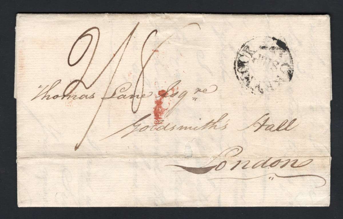558 CVR   image1799 Folded Letter From Jamaica to England, via Scotland, the letter (written by Robert Gibb) is datelined "Kingston 15 Septr 1799" and is addressed to London, with a circular "GREENOCK / SHIP / LRE" handstamp in black and a NOV.8.1799 receiver in red, fine. (Scan 1) (Scan 2) (All Scans) (All Images)