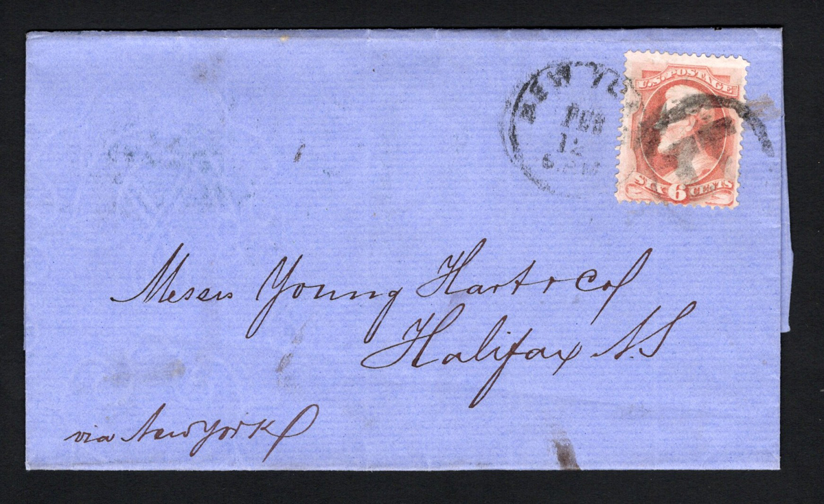 559 CVR   image1874 Kingston Jamaica Cover to Nova Scotia, via Forwarding Agent in New York, no letter inside but docketing reads "Kingston Jamaica February 4, 1874”, addressed to Halifax, Nova Scotia , endorsed “via New York”. Back shows an oval “Forwarded By / J. Leycraft / New York” where a 6c dull pink Lincoln (Scott 159) tied by a New York FEB.12 c.d.s. was applied. Very fine. (Scan 1) (Scan 2) (All Scans) (All Images)