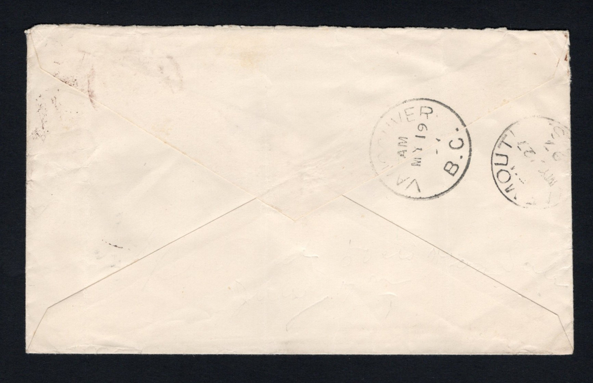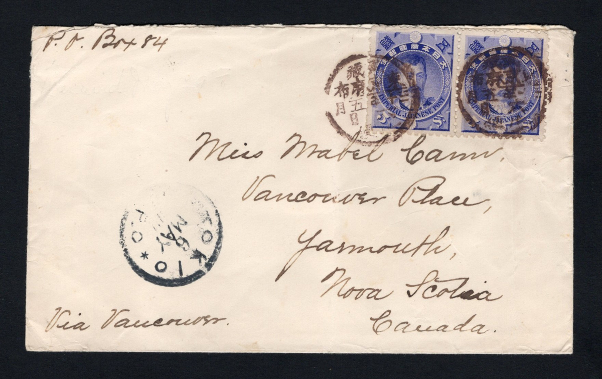 560 CVR   image1897 Japan Cover to Nova Scotia, mailed from Tokyo on MAY.6.1897 (c.d.s. free strike) to Yarmouth Nova Scotia MAY.27 receiver) via Vancouver BC (MAY.19 transit). Franked with a pair of 5s Gen. Yoshihisa Kitashirakawa issues (Scott #88), each tied by a Japanese c.d.s., very fine. (Scan 1) (Scan 2) (All Scans) (All Images)