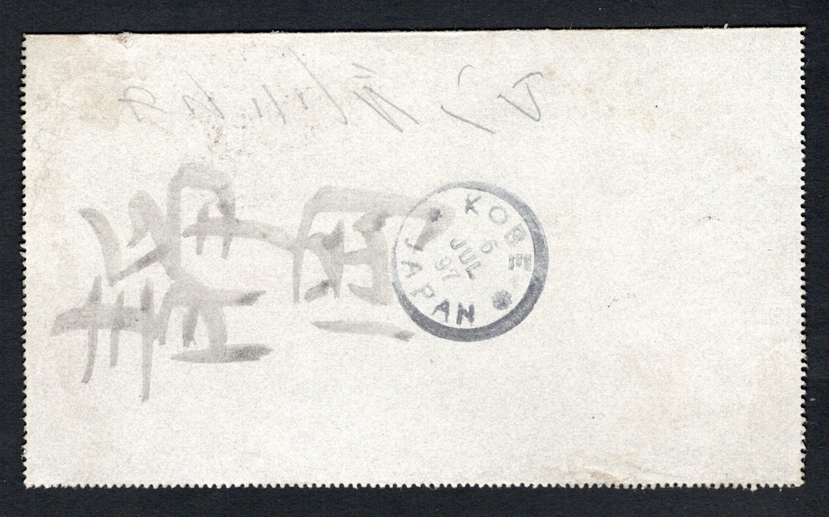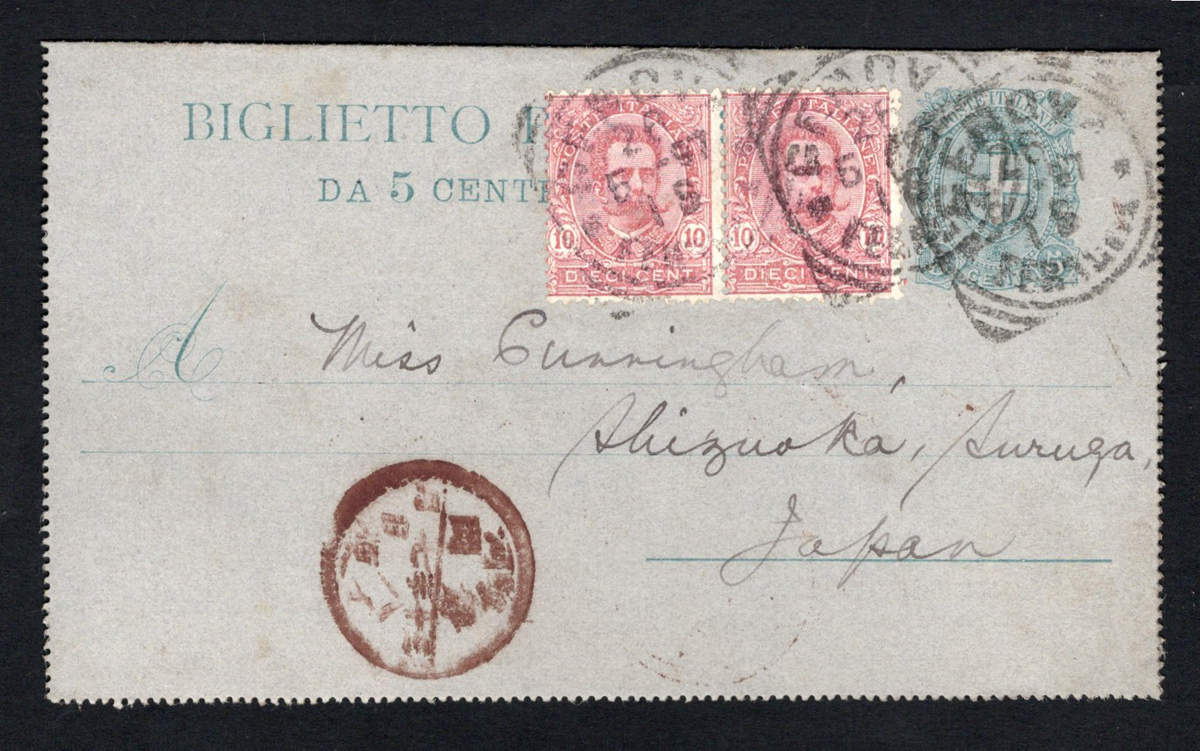 554 PC 68 image1897 Italy Letter Card to Japan, a 5c (uprated to 25c) letter card (H&G #4) mailed from Genova on MAY.26.1897 (three squared circle strikes) to Shizuoka Japan, via Kobe (JUL.6.1897 c.d.s. receiver). Part of the message inside reads “… this is the only kind of postcard they have in Italy”, very fine. (Scan 1) (Scan 2) (All Scans) (All Images)