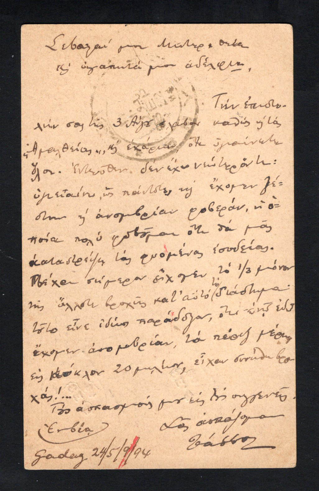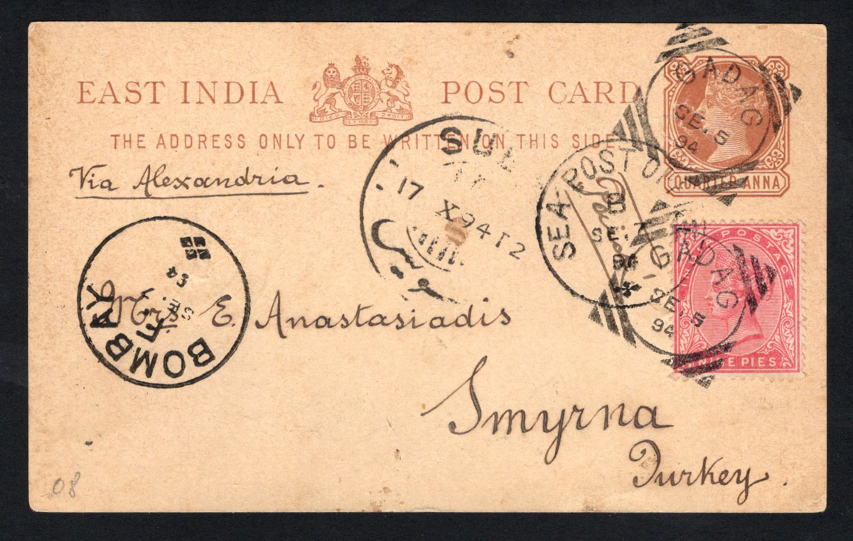 545 PC   image1894 India Postal Card to Smyrna, Turkey, a quarter Anna postal card uprated with an India 9 pies stamp mailed from Gadag on SEP.5.1894 (two very fine strikes of the squared circle) to Smyrna, Turkey, endorsed “via Alexandria” with a SEP.7.1894 Sea Post Office c.d.s., a SEP.7.1894 Bombay c.d.s. transit, an indistinct SEP.22 bilingual transit on back, and a large OCT.17.1894 Suez bilingual transit c.d.s. on front. Very fine and scarce. (Scan 1) (Scan 2) (All Scans) (All Images)