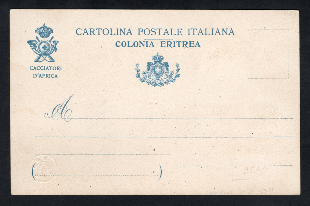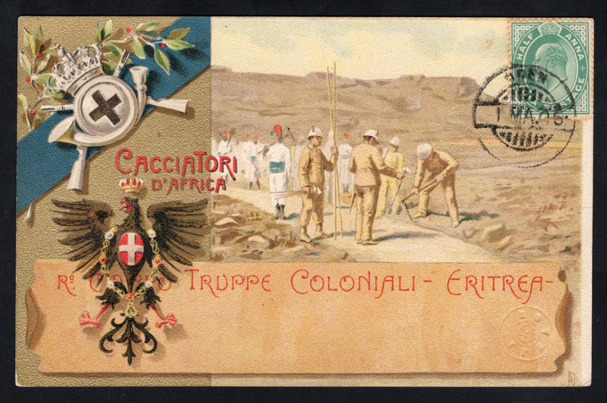546 PC   image1906 India Used in Aden Illustrated Eritrea Card, a ½s India KEVII stamp is tied by a double circle MAY.1.1906 postmark from Aden, on an illustrated card reading (on picture side) "Truppe Coloniali - Eritrea" and "Cacciatori D'Africa" and on the message side "Cartolina Postale Italiana / Colonia Eritrea", unmailed and very fine. (Scan 1) (Scan 2) (All Scans) (All Images)