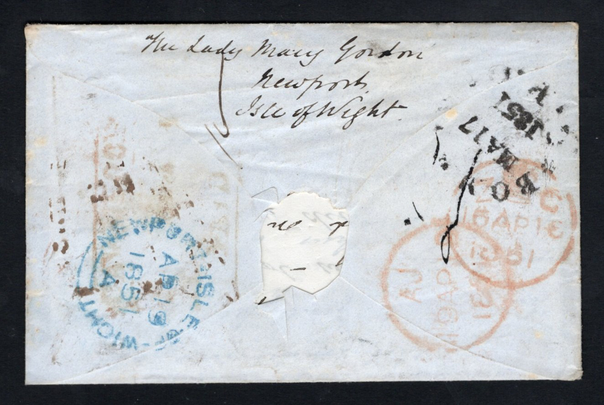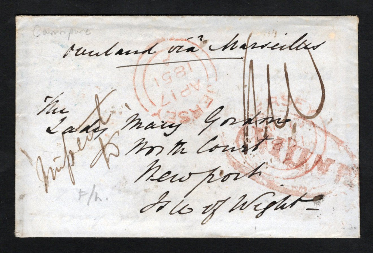 544 CVR   image1851 Cover Mailed from India to Isle of Wight, Redirected to Jersey, an envelope with 4 page letter inside (with three-masted ship embossed logo) mailed from India (MAR.17.1851 Bombay despatch on back) to "The Lady Mary Gordon" on the Isle of Wight (APR.19.1851 Newport Isle of Wight receiver in blue) endorsed "overland via Marseilles". The letter is marked "mifsent to" and was redirected to Jersey and has a APR.17.1851 double arc receiver in red. Back also has two London GPO datestamps in red (APR.16 and APR.19). Lady Gordon, a.k.a. "Mrs Disney Leith" or "Mary Charlotte Julia Leith", was a British novelist who often traveled to Iceland and translated Icelandic novels (see Wikipedia). Very fine, unusual and a well travelled little cover. (Scan 1) (Scan 2) (All Scans) (All Images)