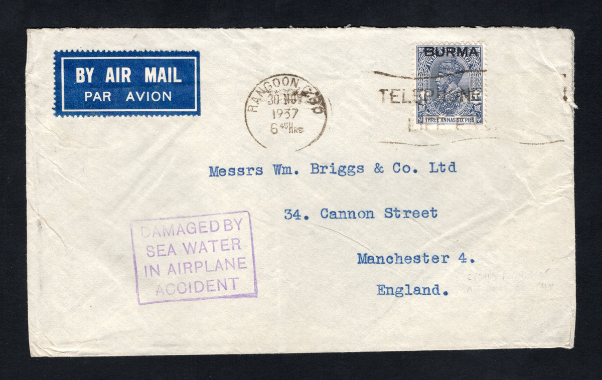 547 CVR   image1937 Rangoon India "Cygnus" Airmail Crash Cover to England, mailed Rangoon on NOV.30.1937 to Manchester, England aboard the "Cygnus" which crashed in Brindisi with mail from India and Australia, with the stewart and one passenger killed. With violet boxed "Damaged by / Sea Water / in Airplane / Accident" handstamp. A very fine cover which still has its Burma overprinted stamp, considering that all the mail had to be salved from salt water.