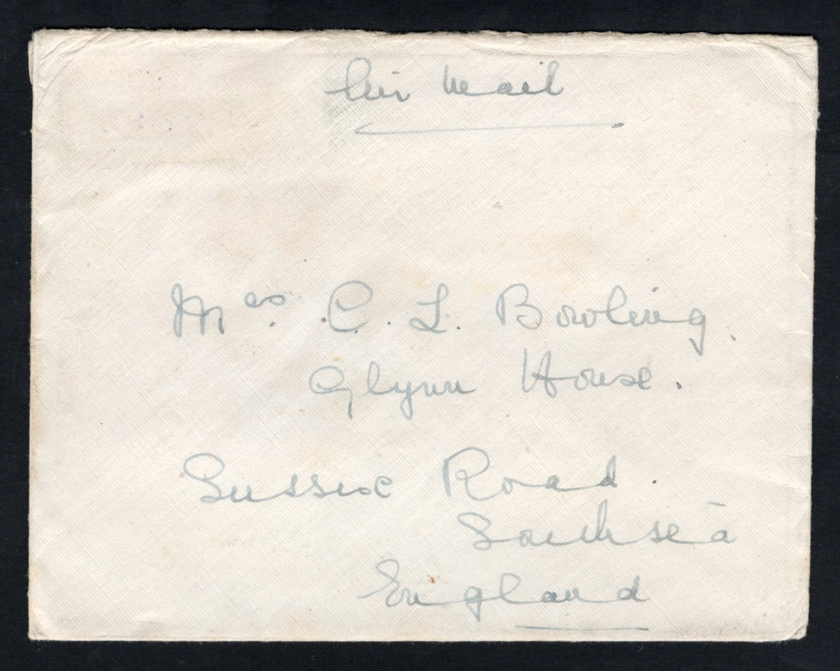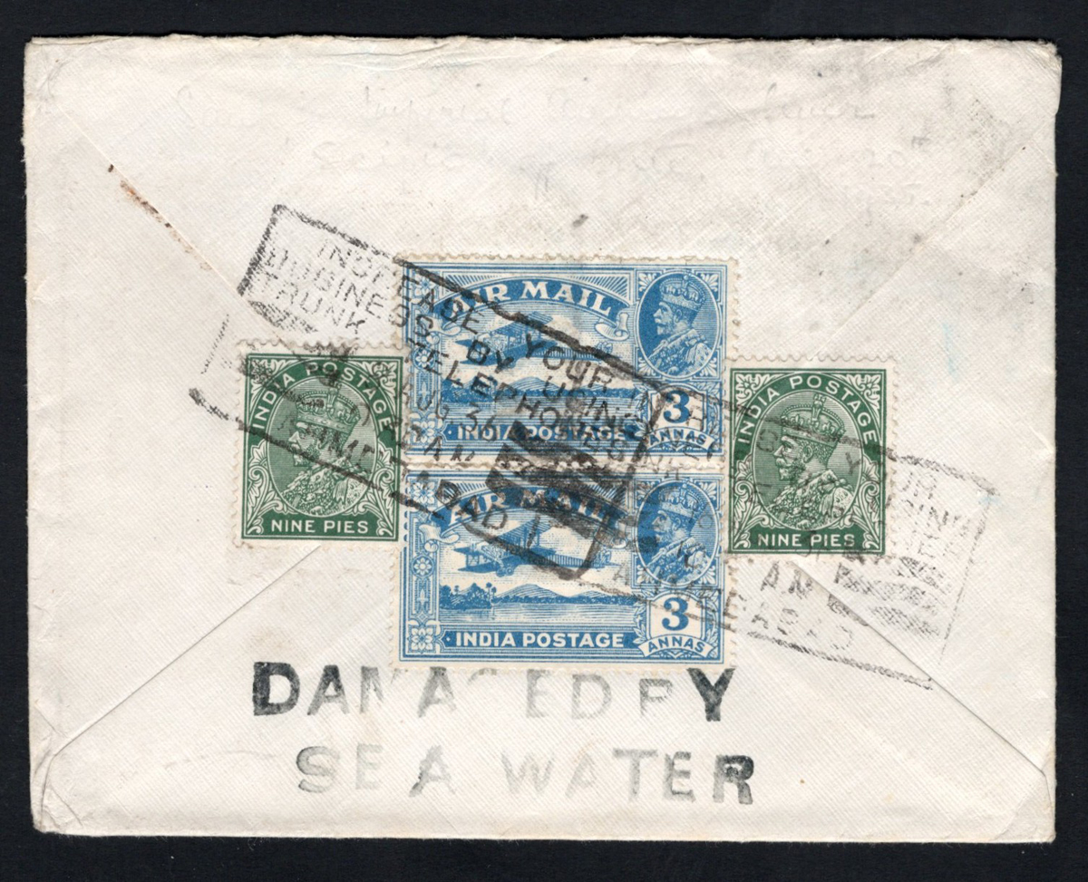 548 CVR   image1936 Ahmedabad India to England "Scipio" Airmail Crash Cover, mailed AUG.18.1936 with 18 pies postage plus 6 annas airmail fee (all on back of cover), canceled by Ahmadabad boxed slogan cancels. The airplane "Scipio" crashed in the sea off the coast of Crete during a storm, and the mail addressed to England was quickly taken to London, where it arrived on AUG.25. Two passengers lost their lives. Back of cover shows a two-line handstamp in black reading "DAMAGED BY / SEA WATER". Very fine. (Scan 1) (Scan 2) (All Scans) (All Images)