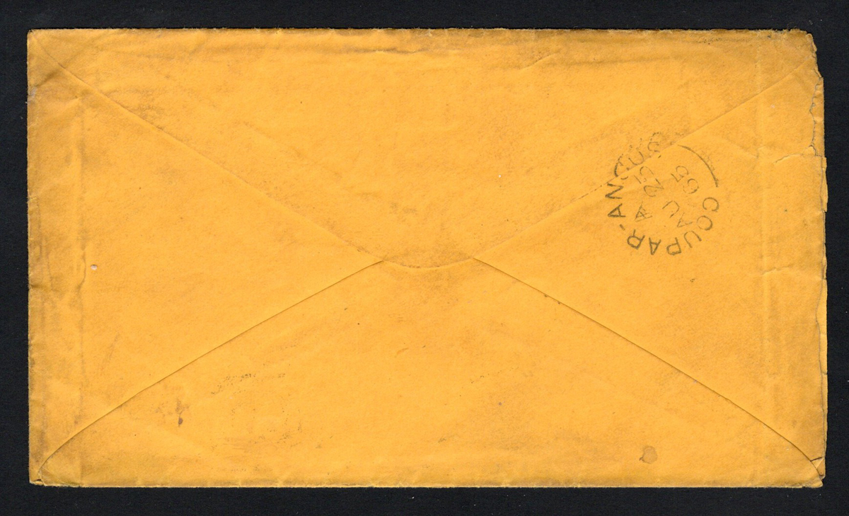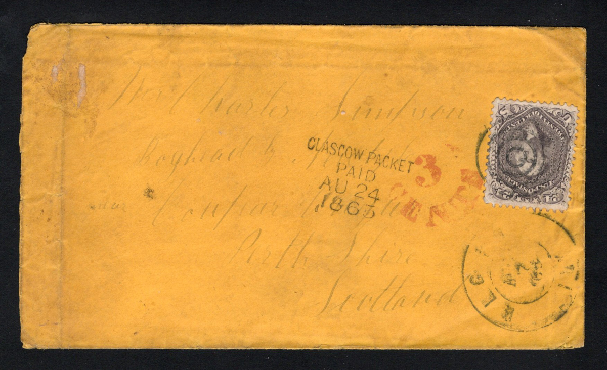 590 CVR 78 image24c Washington on 1863 Cover to Scotland, mailed from an unknown location (AUG.7 double circle duplex) to Coupar-Angus Scotland (AUG.25.1863 receiver on back) with "Glasgow Packet / Paid / AU 24 / 1863" transit. with "3 / Cents" rate handstamp in red. Franked with a fine 24c deep lilac Washington, tied by duplex. Overall aging, still fine. (Scan 1) (Scan 2) (All Scans) (All Images)