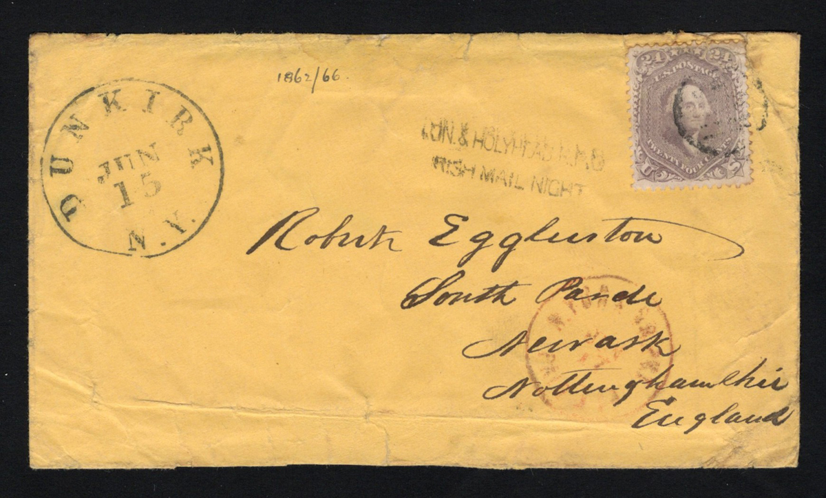 591 CVR 78 image24c Washington on 1863 Cover to Scotland, mailed Dunkirk NY on JUN.15 (large circular datestamp) to Newark, England (JUN.29.1863 receiver on back) with partial "N. York Br. Pkt JUN 17" c.d.s. in red and a "LON. & HOLYHEAD R.P.O / IRISH MAIL NIGHT" railway handstamp. Franked with a 24c pale lilac Washington (small tear), tied by circular grid. Tears and repairs, else generally fine. (Scan 1) (Scan 2) (All Scans) (All Images)