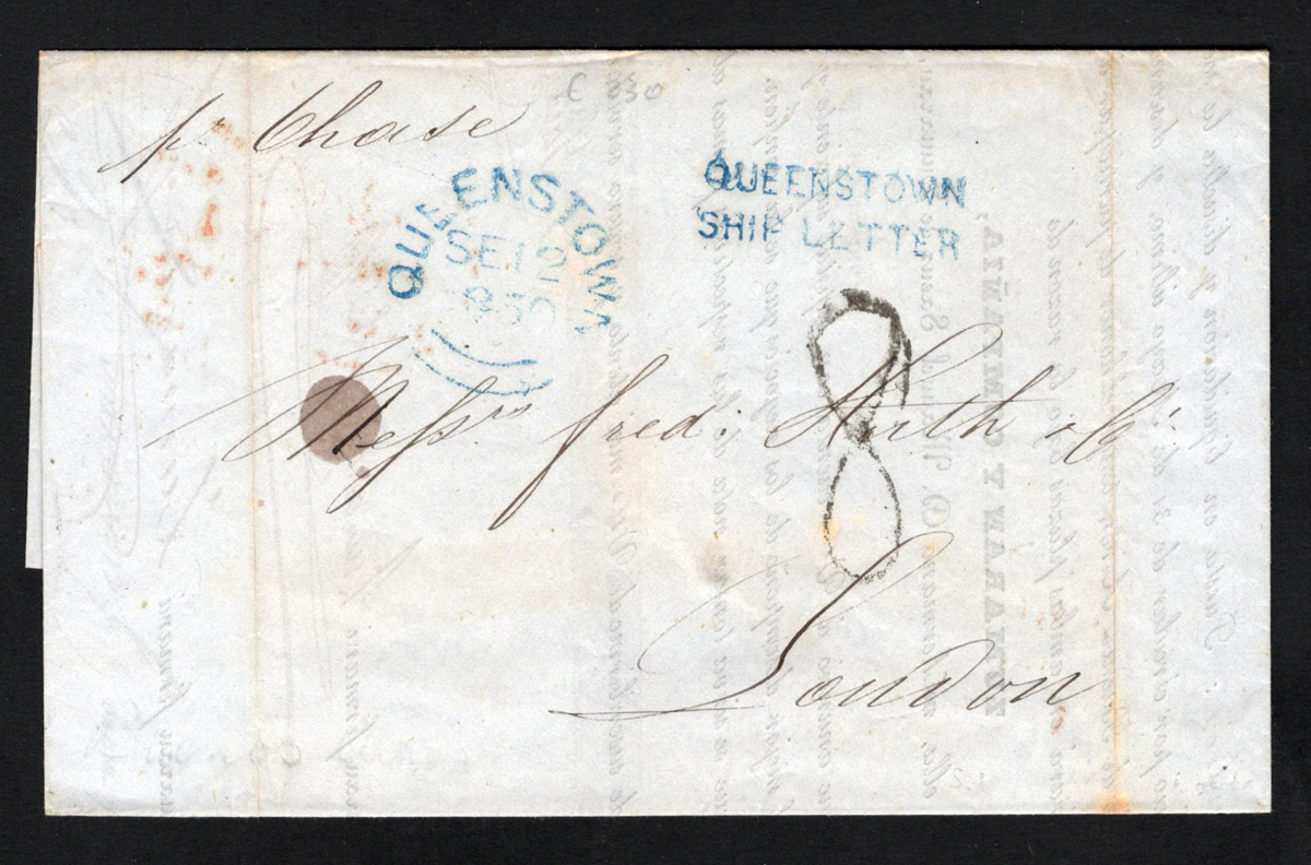 593 CVR   image1850 Uruguay Folded Printed Letter to England, via Ireland and Argentina, letter inside is datelined Montevideo July 1, 1850. Docketing indicates it would have gone through Buenos Aires on July 5. Front has a Queenstown c.d.s. dated SEP.12.1850 and a "QUEENSTOWN / SHIP LETTER" handstamp, both in blue green. Very fine and well travelled. (Scan 1) (Scan 2) (All Scans) (All Images)