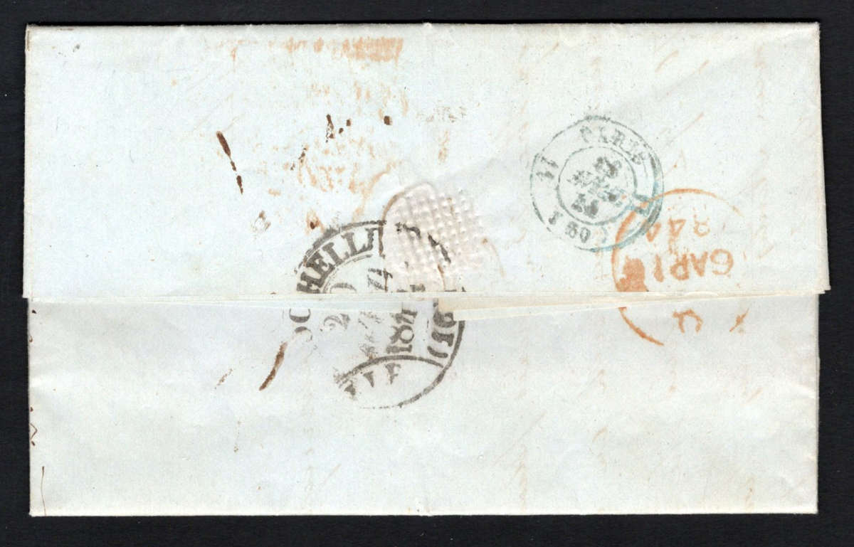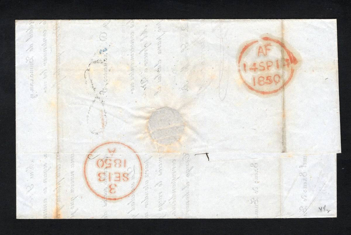 582 CVR   image1843 Folded Letter from New York to France, a two page letter (in French) is datelined "New York, le 31 Aout 1843” and addressed to Niort, France (SEP.1843 receiver,) via London (SEP.15 c.d.s. on back), with a boxed “SP 14 43 / LIVERPOOL / SHIP” in black, boxed “COLONIES / &c ART.12” in orange, a Boulogne entry c.d.s. in deep orange (SEP.17) and a Paris SEP.17 transit in blue. There is a manuscript “Steamer Great Western”. Very fine, and well written-up on a page. (Scan 1) (Scan 2) (All Scans) (All Images)