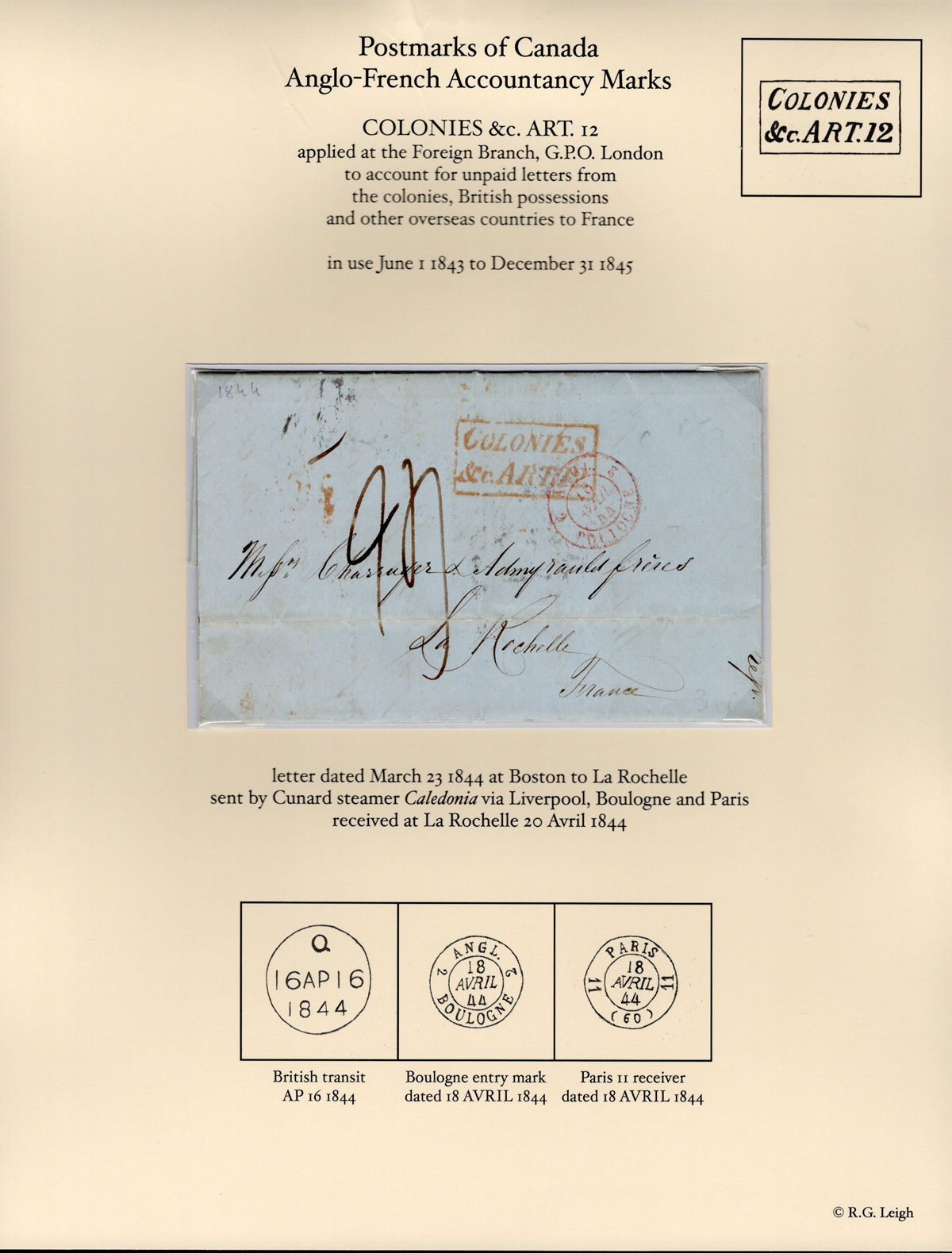 581 CVR   image1844 Folded Letter Boston to France, two letters inside are datelined Boston MAR.23 and APR.1, 1844, addressed to La Rochelle, with APR.20.1844 receiver on back, via Q British transit on APR.16, Boulogne entry on APR.18 and Paris APR.18.The letter has a boxed "COLONIES / &c. ART,12" accountancy handstamp and is very fine. (Scan 1) (Scan 2) (All Scans) (All Images)