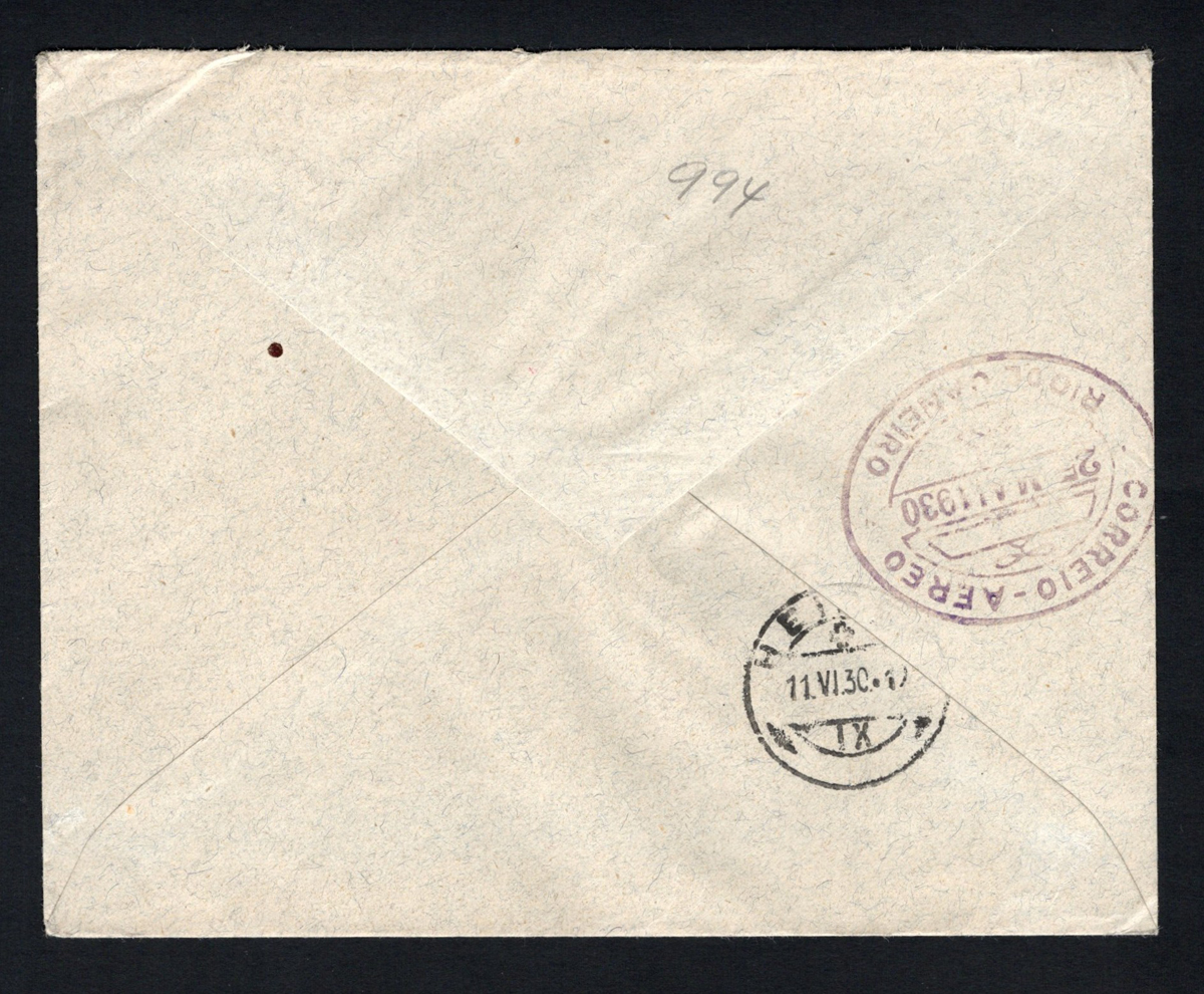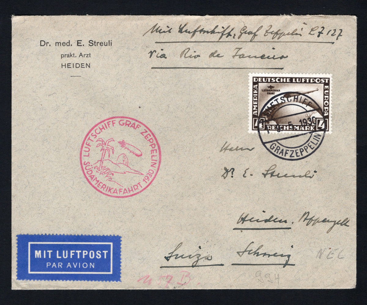 595 CVR Germany image1930 Graf Zeppelin Cover to Switzerland, via Brazil, mailed on MAY.9.1930, franked with a Scott C39, 4m Zeppelin stamp, to Switzerland (JUN.11 receiver) via Rio de Janeiro (MAY.25 oval transit on back), with red flight cachet, very fine. (Scan 1) (Scan 2) (All Scans) (All Images)