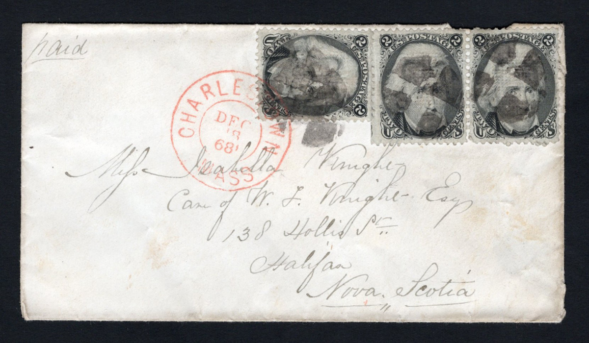 589 CVR 73 image1868 6c Rate Cover to Nova Scotia, mailed from Charlestown Mass. on DEC.18.1866 (double circle in red) to Halifax, Nova Scotia (DEC.22 receiver), franked with three (pair and single) 2c black Jackson issues (tied by quartered corks) paying a 6c rate. The left side of the left stamp in the pair appears to be missing its perforations and had to be separated by scissors. Small opening faults at right, still a very fine cover to a better destination.