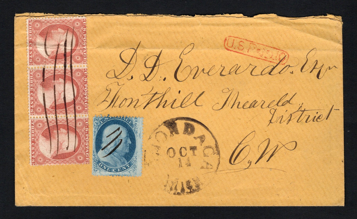 586 CVR 24, 26 image1861 10c Rate Cover to Canada West, mailed from Onondaga Mich. on OCT.14 (large c.d.s.) to Fonthill Canada West (OCT.16.1861 receiver). There is a red boxed “US PAID 10” handstamp, also franked with a horizontal strip of three of the 3c Washington (Scott #26) and a 1c blue Franklin perf 15½ with side scratches (Scott #24), all canceled by pen. Horizontal crease runs through one of the stamps, else very fine and attractive.