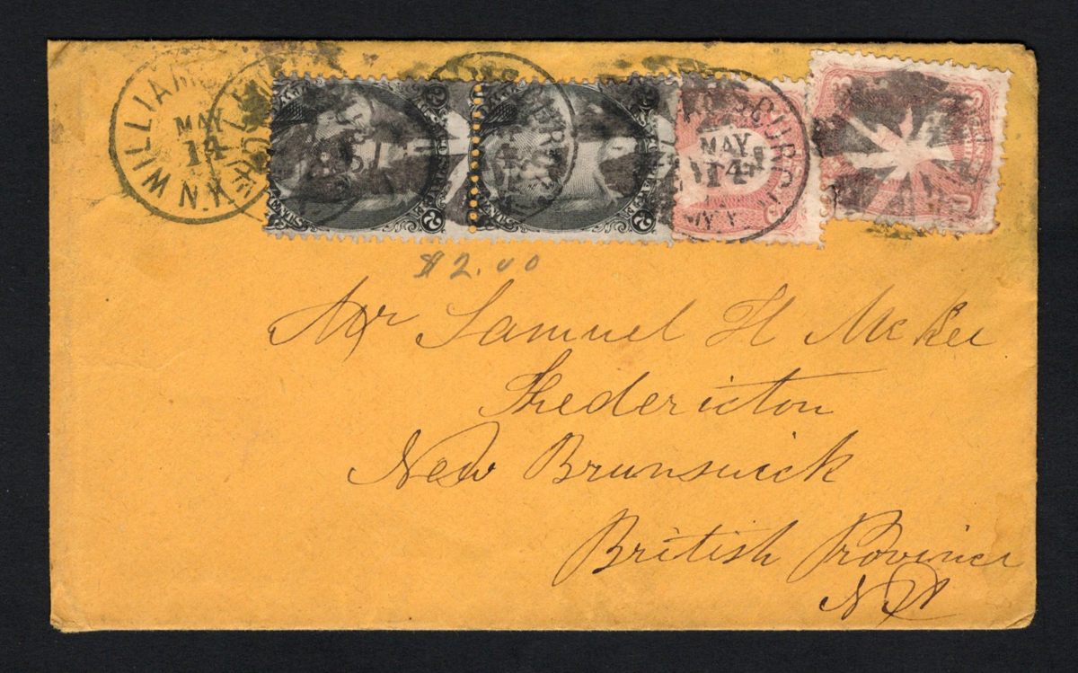 587 CVR 64, 73 image1867 10c Rate Cover to New Brunswick, mailed from Williamsburgh NY on MAY.14 (four strikes of their segmented cork duplex) to Fredericton, New Brunswick (MAY.18.1867 receiver) via Saint John NB (MAY.17.1867 receiver). The cover is franked with two 3c Washingtons and a vertical pair of 2c Jacksons, all paying the 10c rate. Slightly reduced at left (does not detract), very fine. (Scan 1) (Scan 2) (All Scans) (All Images)