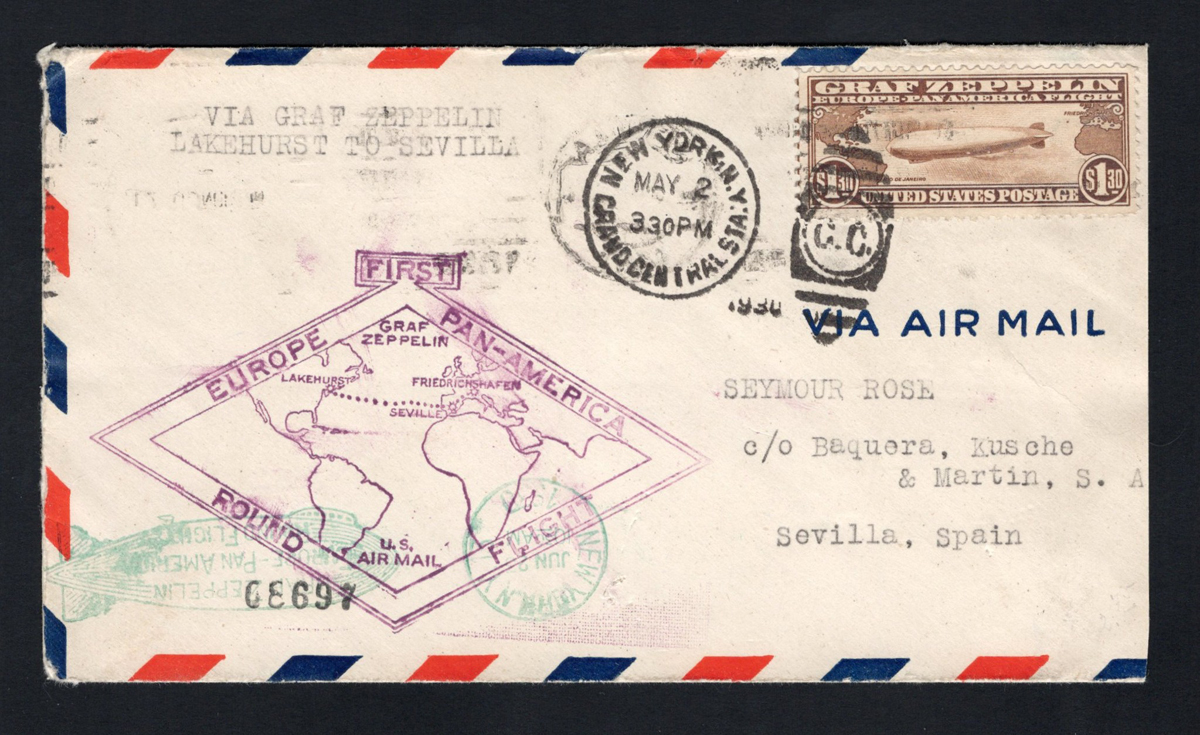 592 CVR C14 image1930 Europe-Pan America Round Flight Zeppelin Cover, mailed from New York City (Grand Central Station) on MAY.2.1930 (“C.C.” duplex) to Sevilla Spain (JUN.7.1930 slogan machine receiver on back) with a Seville Customs House double oval handstamp also on back. Franked with a Scott # C14 $1.30 brown Zeppelin Passing Globe issue, cover has the diamond first flight cachet, plus a typed notation “via Graf Zeppelin Lakehurst to Seville” at upper left, very fine. The stamp used on cover catalogues U$390 in Scott. (Scan 1) (Scan 2) (All Scans) (All Images)