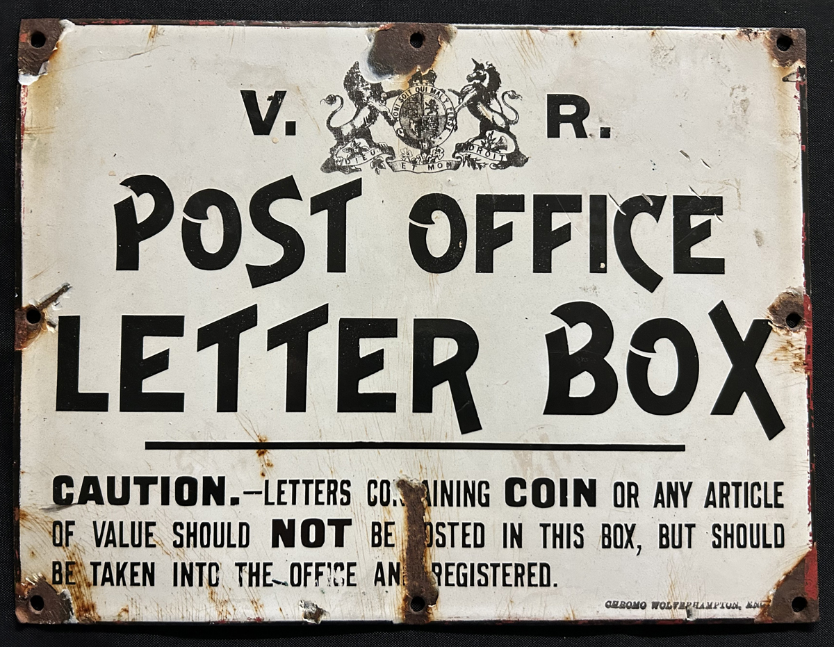 597   imageOriginal Porcelain "Post Office Letter Box" Sign from New Zealand, measuring 35 x 23 cm, with manufacturer "Chrono, Wolverhampton, England", with the usual rust where the 8 holes are, else overall fine. Accompanied by a photograph showing it affixed to a Post Office wall also showing the hours of operation and the closing times for mail to Auckland and Dargaville. (Scan 1) (Scan 2) (All Scans) (All Images)