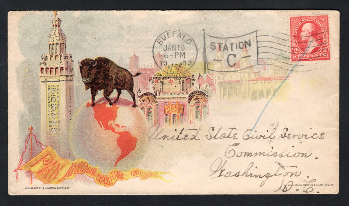 583 CVR   image1903 2c Pan American Illustrated Advertising Cover, mailed from Buffalo, NY on JAN.19.1903 ("Station C" flag cancel) to Washington DC (JAN.20 receiver on back), with colourful exposition illustrations, very fine.