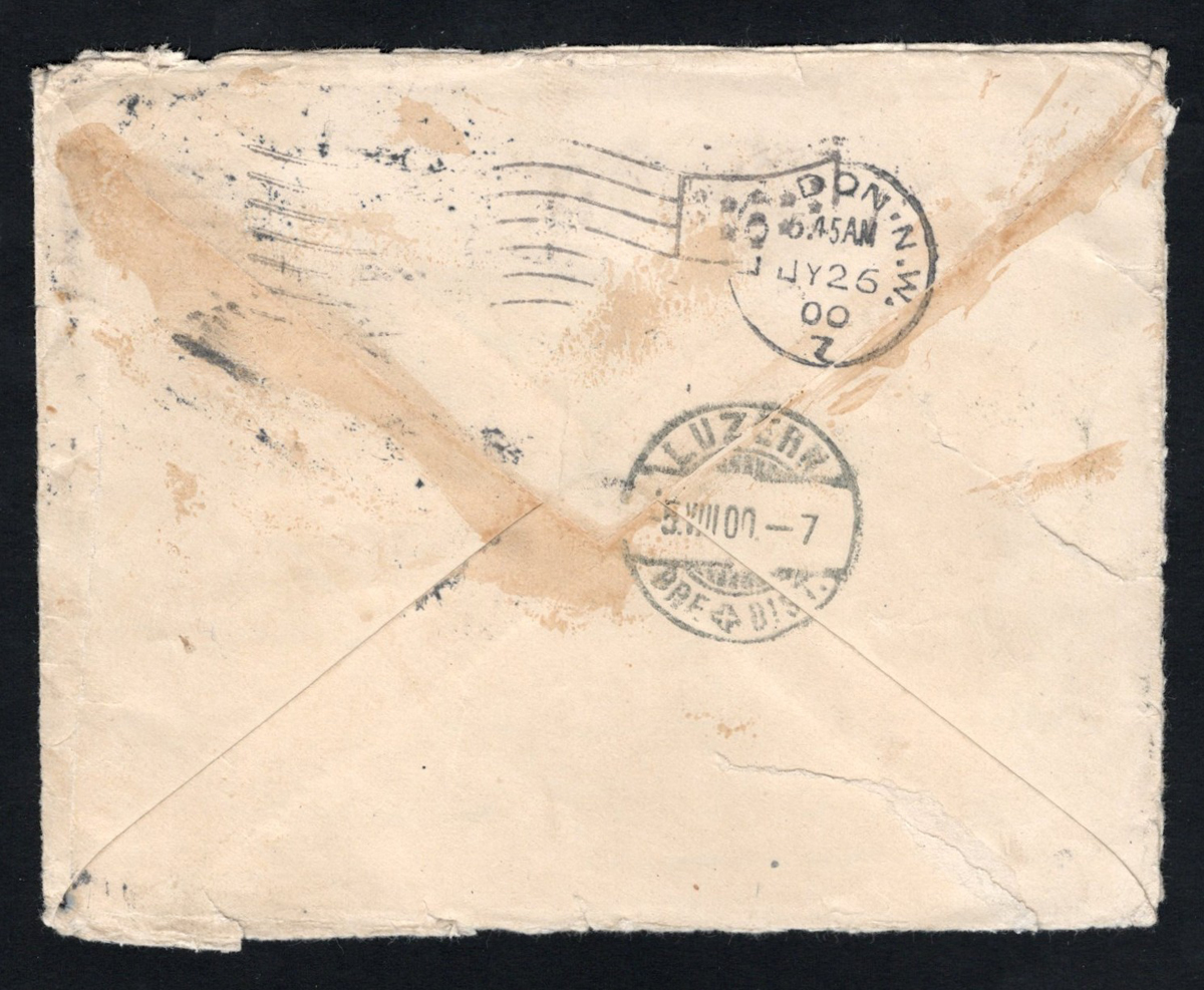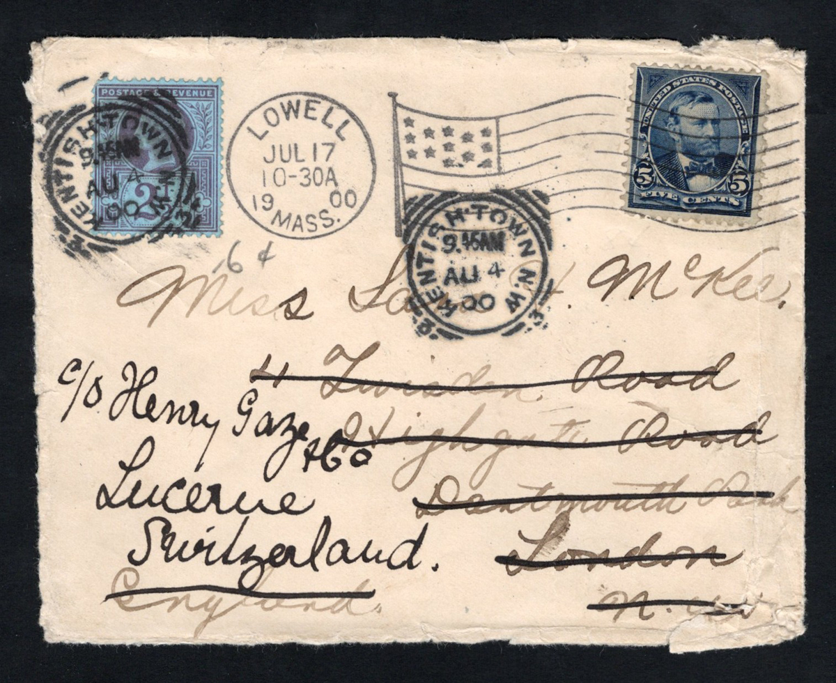 584 CVR   image1900 5c Cover to GB, Forwarded to Switzerland, mailed from Lowell, Mass on JUL.17.1900 to London, England (JUL.26 receiver on back), franked with a 5c blue Grant. Two Kentish Town squared circles on front dated AUG.4.1900, one tying a 2½d blue QV (GB # 114) to forward to Lucerne, Switzerland, with next day receiver on back. Open on three sides and edge wear, else a fine cover. (Scan 1) (Scan 2) (All Scans) (All Images)