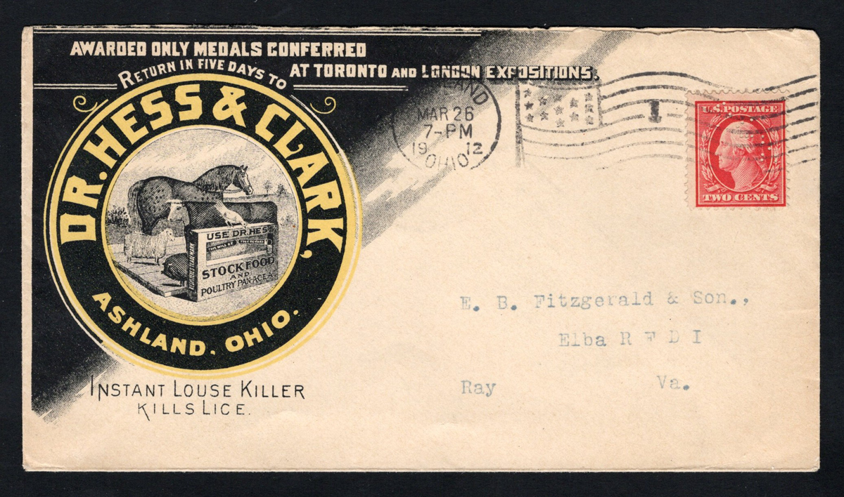 585 CVR   image1912 2c Hess & Clark Illustrated Advertising Perfin Cover, mailed from Ashland, Ohio on MAR.26.1912 to Ray, Virginia (faint receiver on back), franked with a 2c red Washington perfined for Hess & Clark (broken pins), tied by a flag cancel. A lovely and very fine illustrated cover.