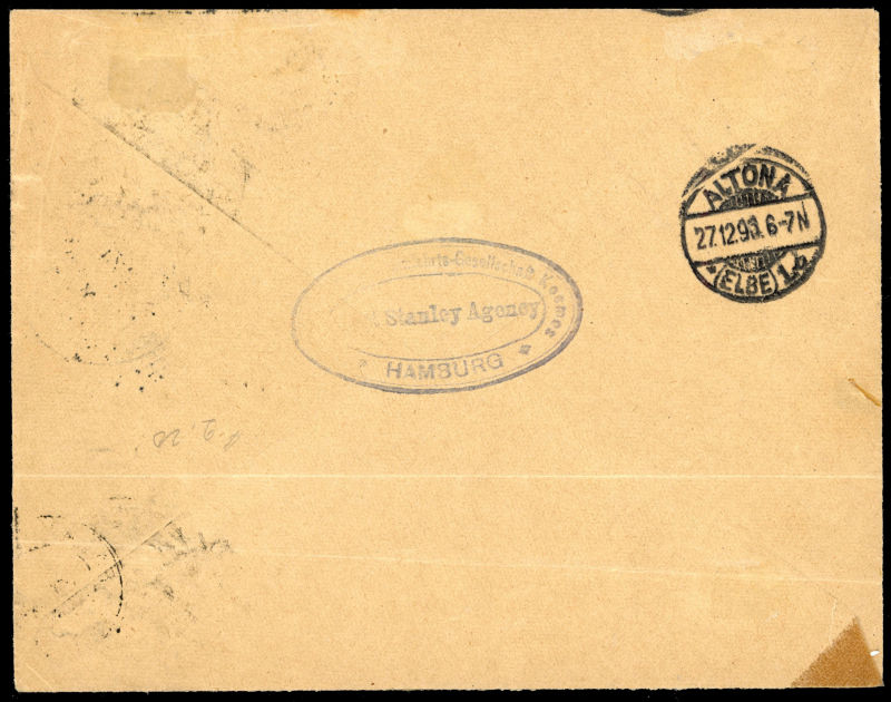 1/90), with very fine type F2 despatch cds below. Carried by S.S. Karnac to Montevideo, thence by PSNC Sorata to London. Slight faults not affecting stamps of fine fresh appearance. An attractive example of this rare usage. S.G. 11/a, cat £4,500 on
