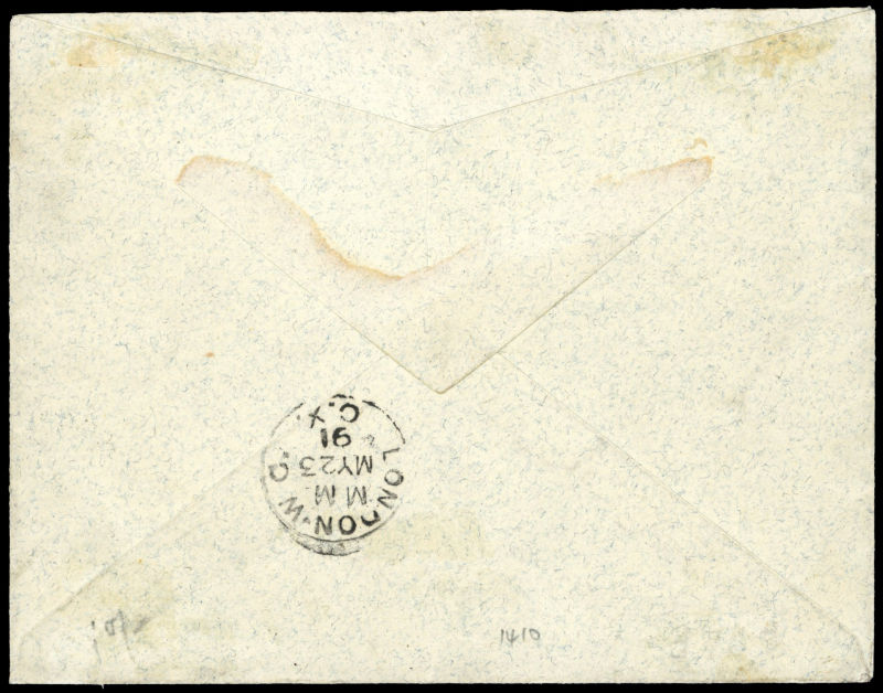 large part envelope to London, bearing 1d red-brown horizontal pair and diagonal bisect, all with watermark reversed. Tied by clear strikes of the ‘Large Squares’ cork cancel (Barnes 1/91), with despatch CDS of OC 28 below. London arrival
