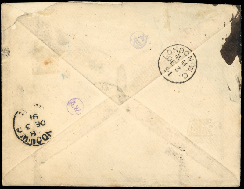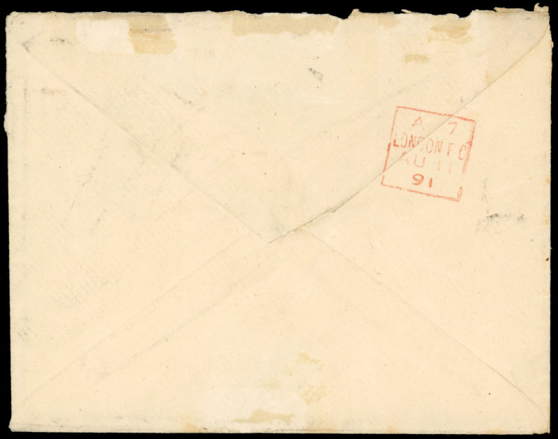 F2 dispatch cds at left. Red London arrival backstamp of 'AU 11 91' on reverse. The piece with the stamps neatly cut out then hinged back into place, and minor creasing, still a fresh and attractive example of this provisional usage. SG 8a cat