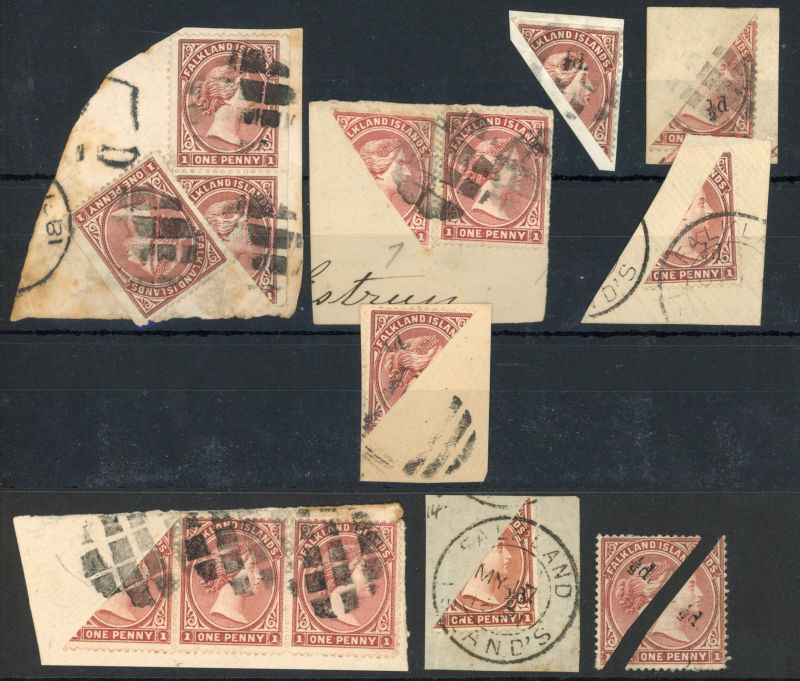 1d bisect provisionals, small range comprising unoverprinted bisects x3 on individual pieces with cork cancels (one as se-tenant strip of 3, one as se-tenant pair), then ½d on half 1d surcharge x5 on individual pieces (two tied by cds) plus two